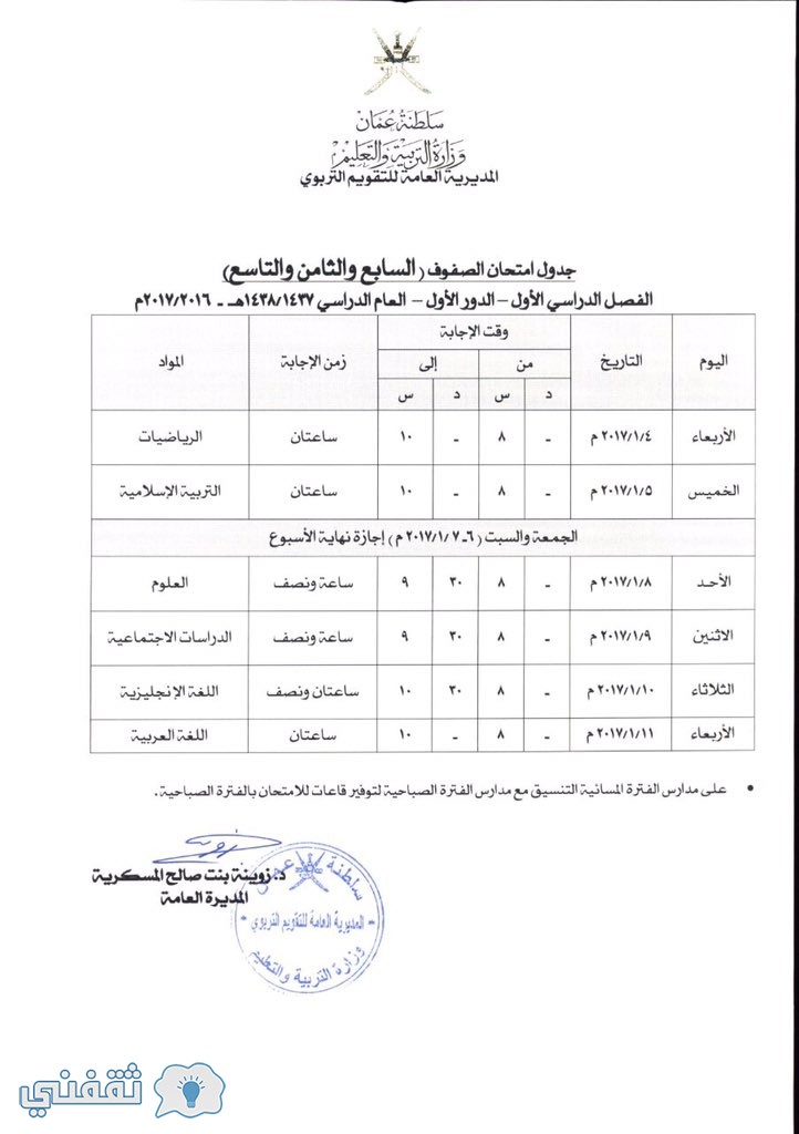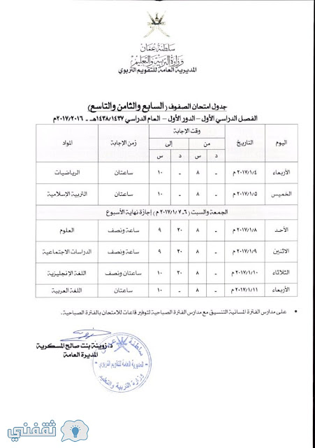 إعتمدت وزارة التربية والتعليم العمانية جدول امتحانات الفصل الدراسي الأول 2017 للدور الأول لجميع الصفوف في سلطنة عمان. و إليكم جدول امتحان الصف الثامن