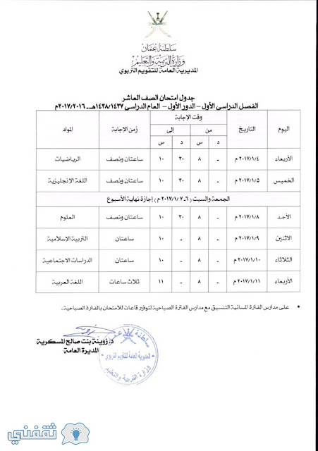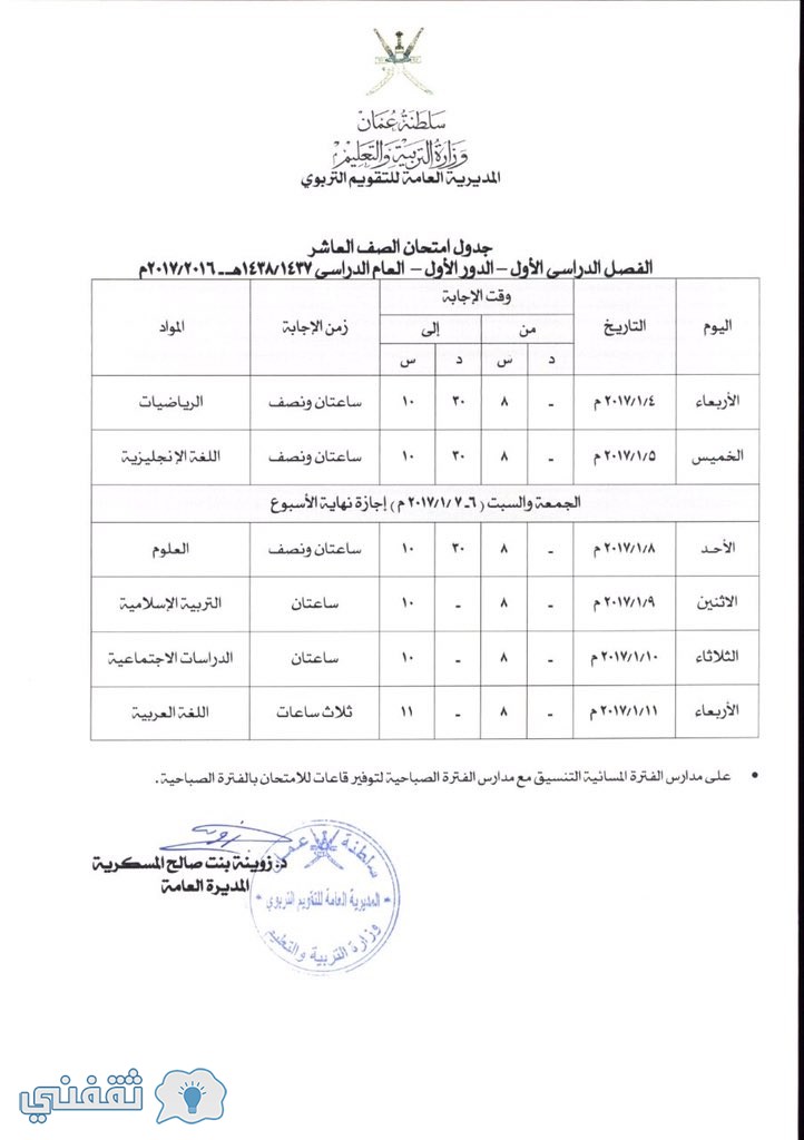 إعتمدت وزارة التربية والتعليم العمانية جدول امتحانات الفصل الدراسي الأول 2017 للدور الأول لجميع الصفوف في سلطنة عمان. وإليكم جدول امتحان الصف العاشر