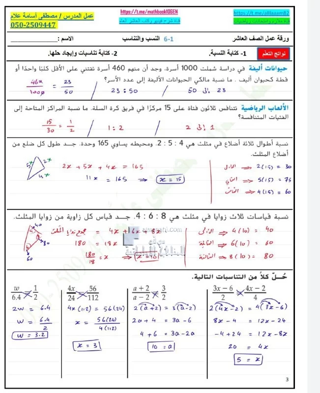 أوراق عمل درس النسب والتناسب مع الحل - إعداد: مصطفى أسامة علام | ||