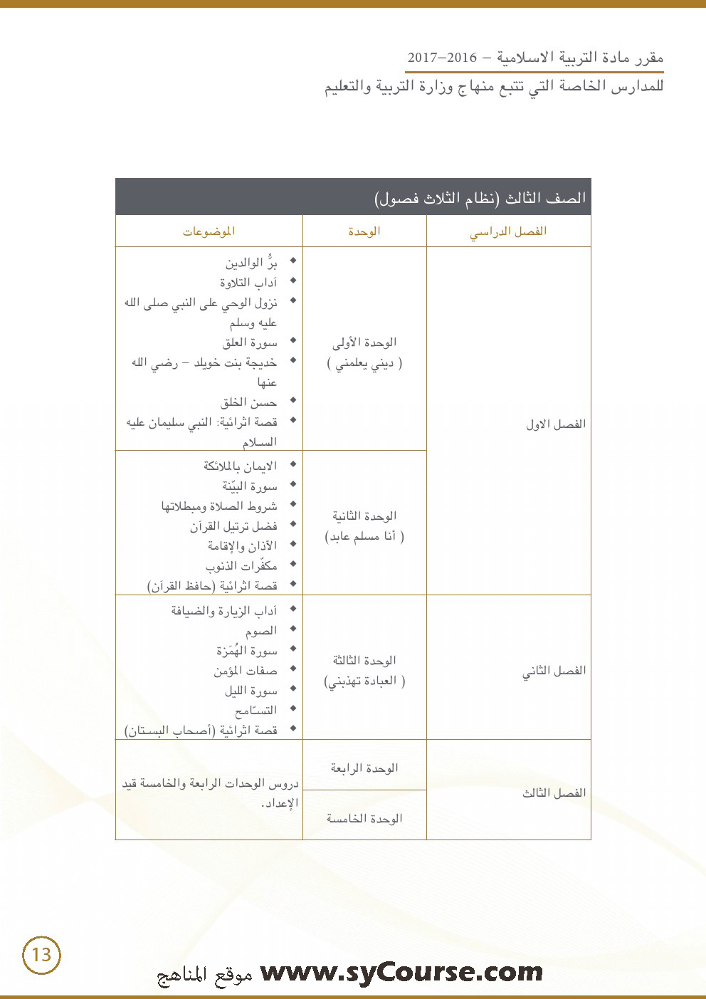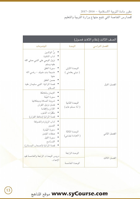 إليكم المقررات الدراسية للصف الثالث (نظام الفصلين والثلاث فصول والأربع فصول) للمدارس التي يطبق بها منهاج وزارة التربية والتعليم العام وذلك للعام الدراسي 2016-2017 | ||
