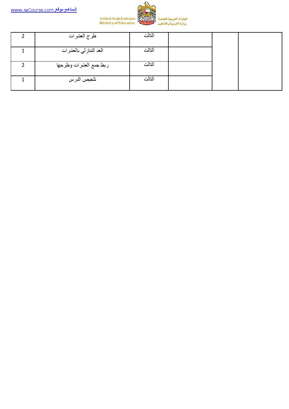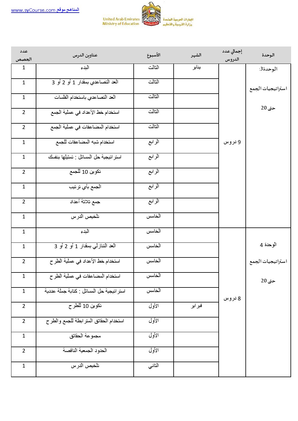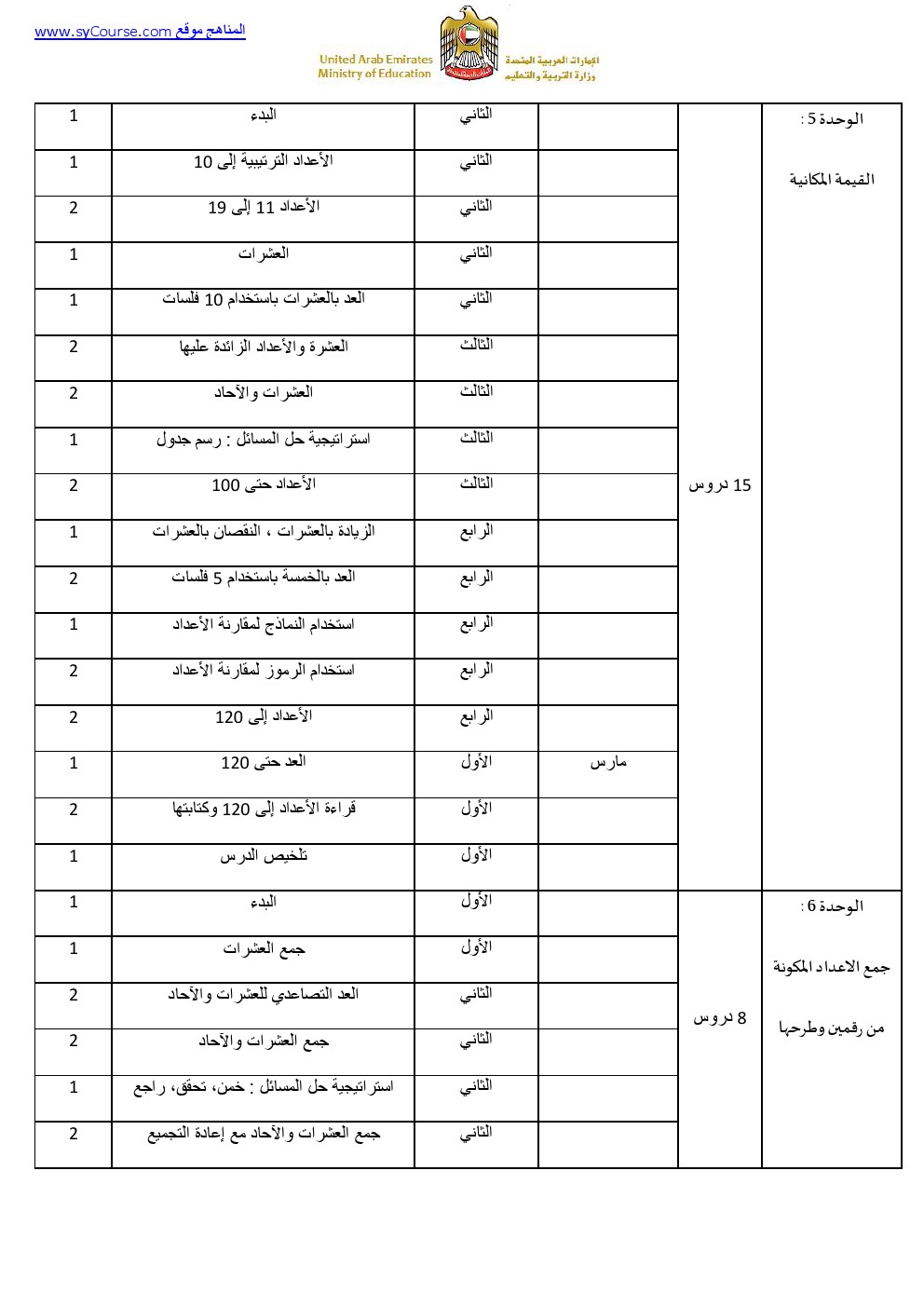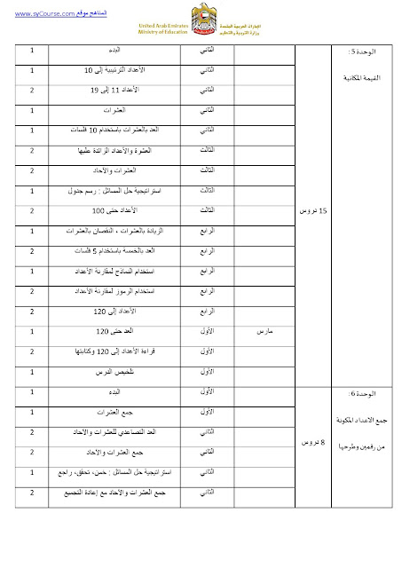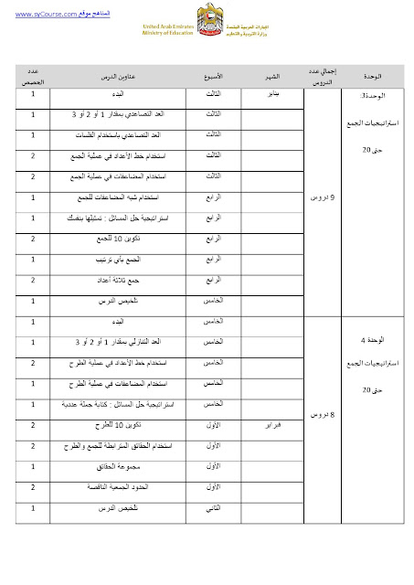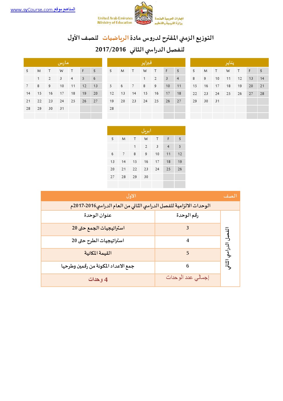 إليكم التوزيع الزمني لمادة الرياضيات للصف الأول - الفصل الثاني من العام الدراسي 2016-2017