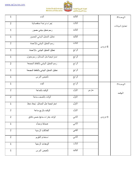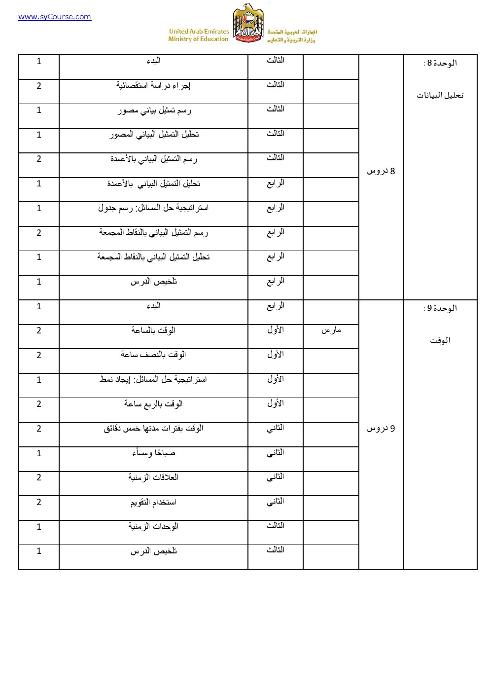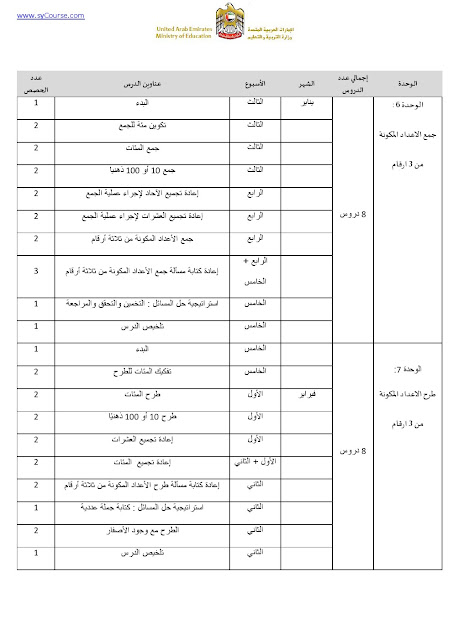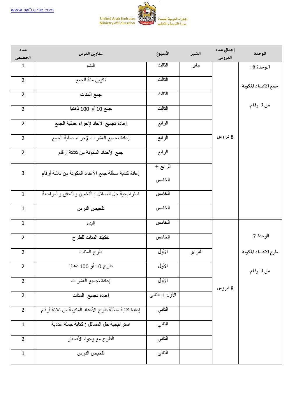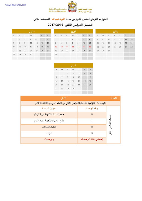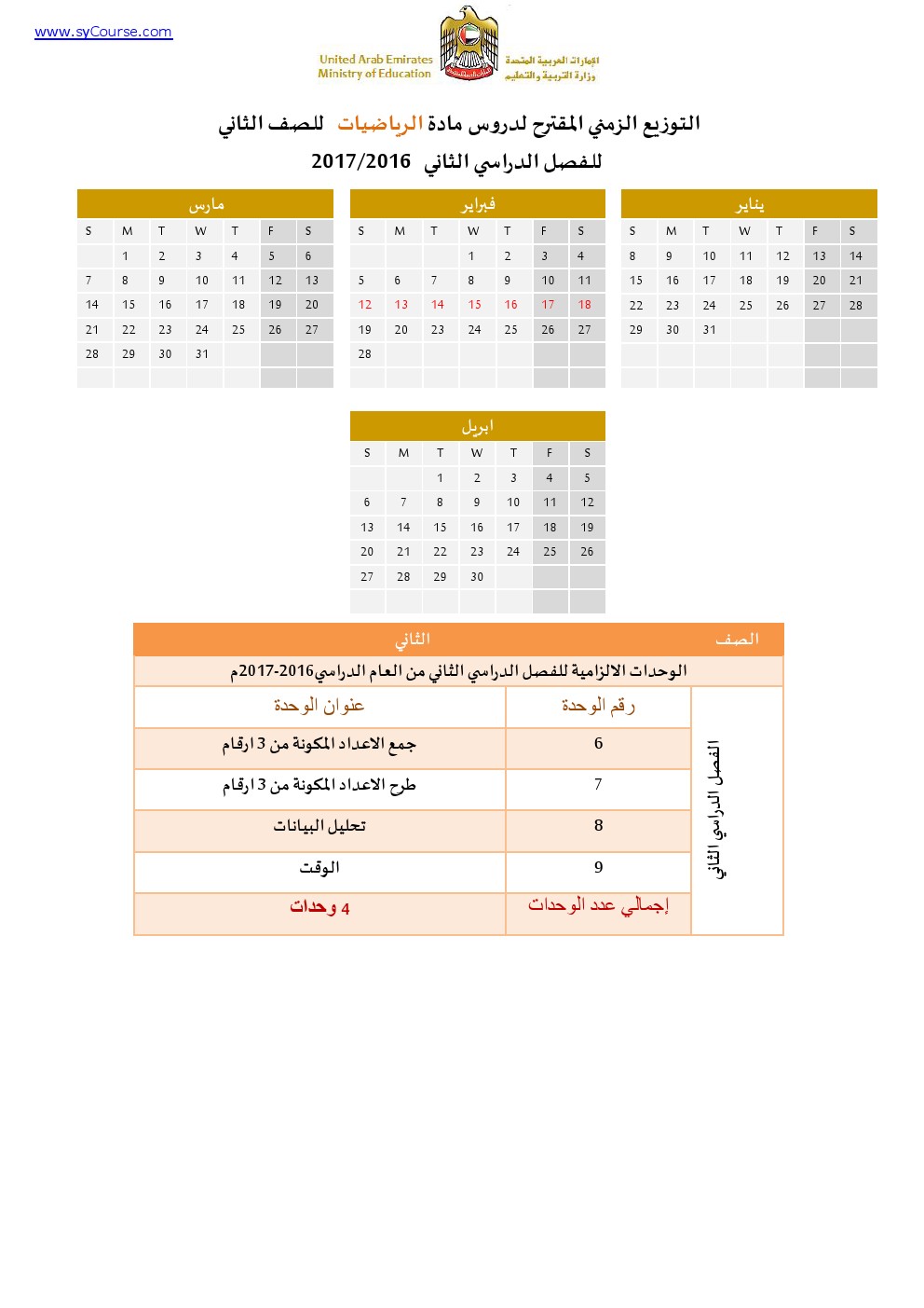 الصف الثاني, الفصل الثاني, رياضيات, التوزيع الزمني للعام الدراسي 2016-2017 وفق المنهاج الاماراتي الحديث