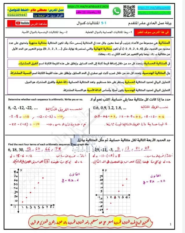 حل الدرس الأول المتتاليات كدوال من الوحدة التاسعة - إعداد: مصطفى أسامة علام