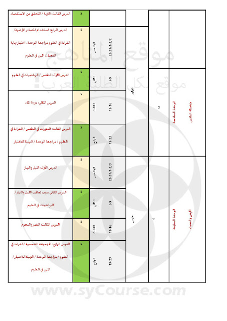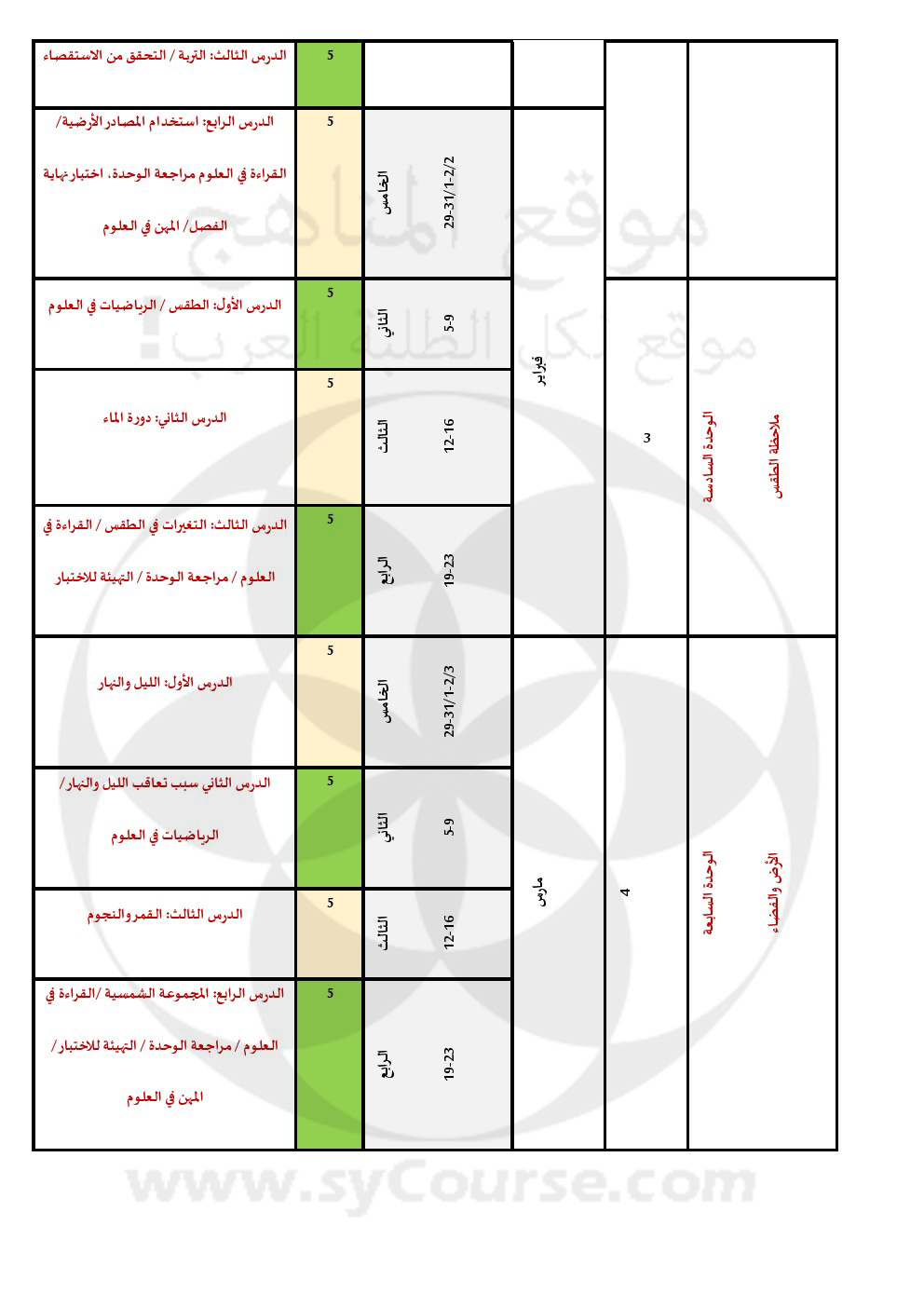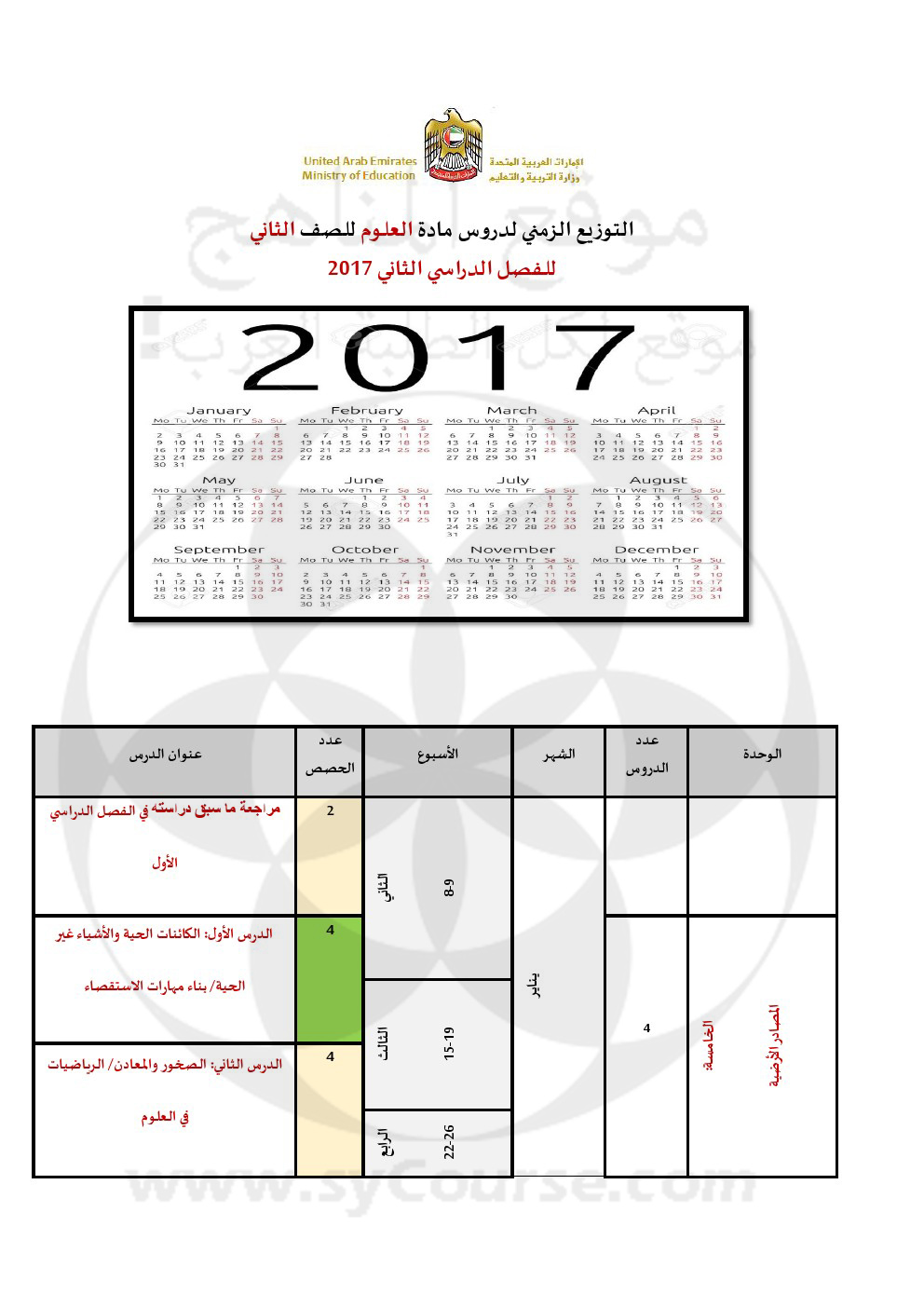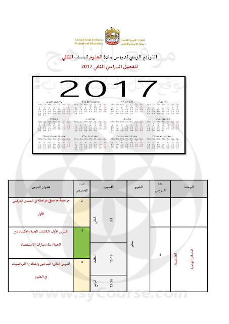 إليكم التوزيع الزمني في مادة العلوم للصف الثاني - الفصل الثاني وفق المنهاج الاماراتي 2017