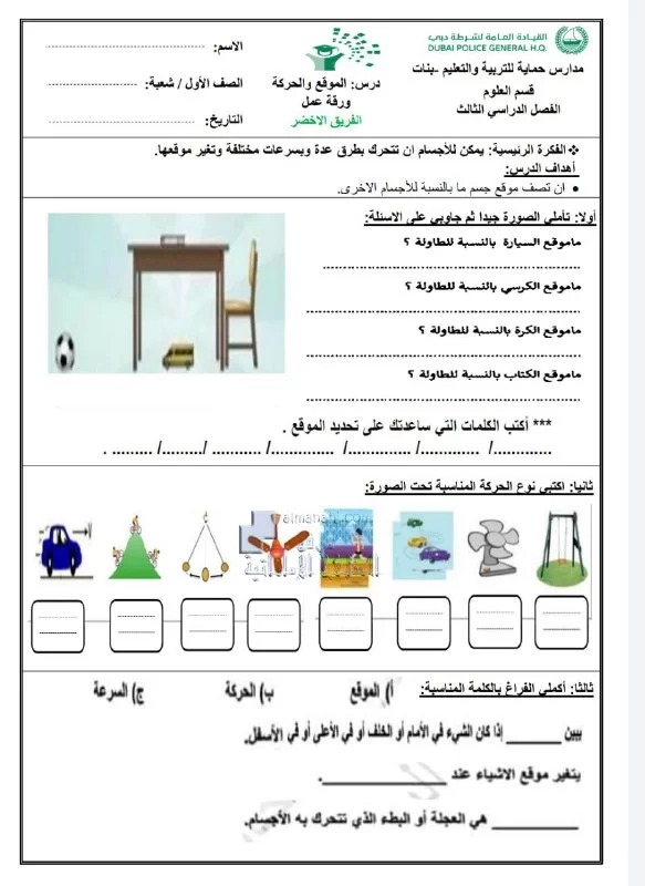 أوراق عمل درس الموقع والحركة | ||