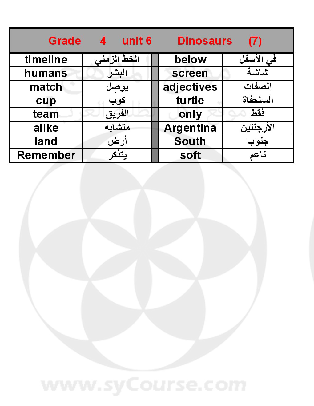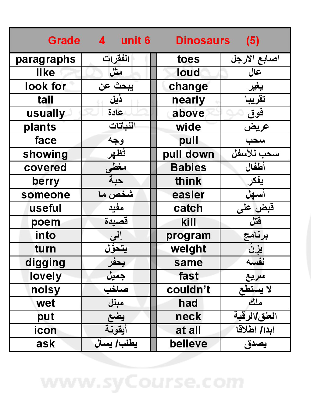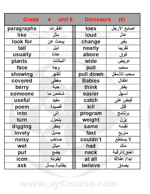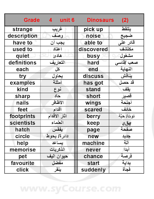 معلومات الملف: الصف الرابع, الفصل الثاني, لغة انكليزية, مفردات وحدة الديناصورات مع الترجمة 2017 | ||