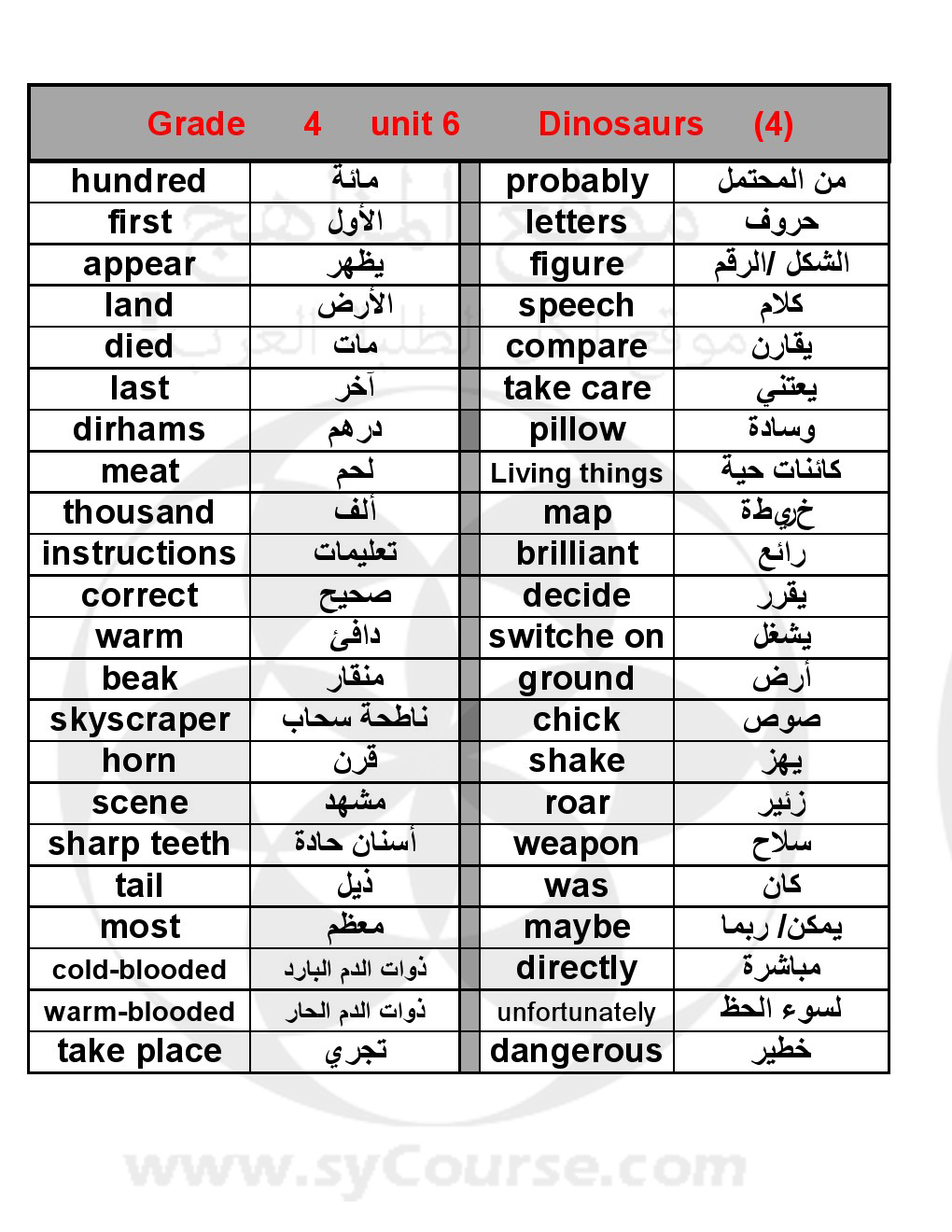 | مفردات وحدة الديناصورات مع الترجمة 2017 | ||