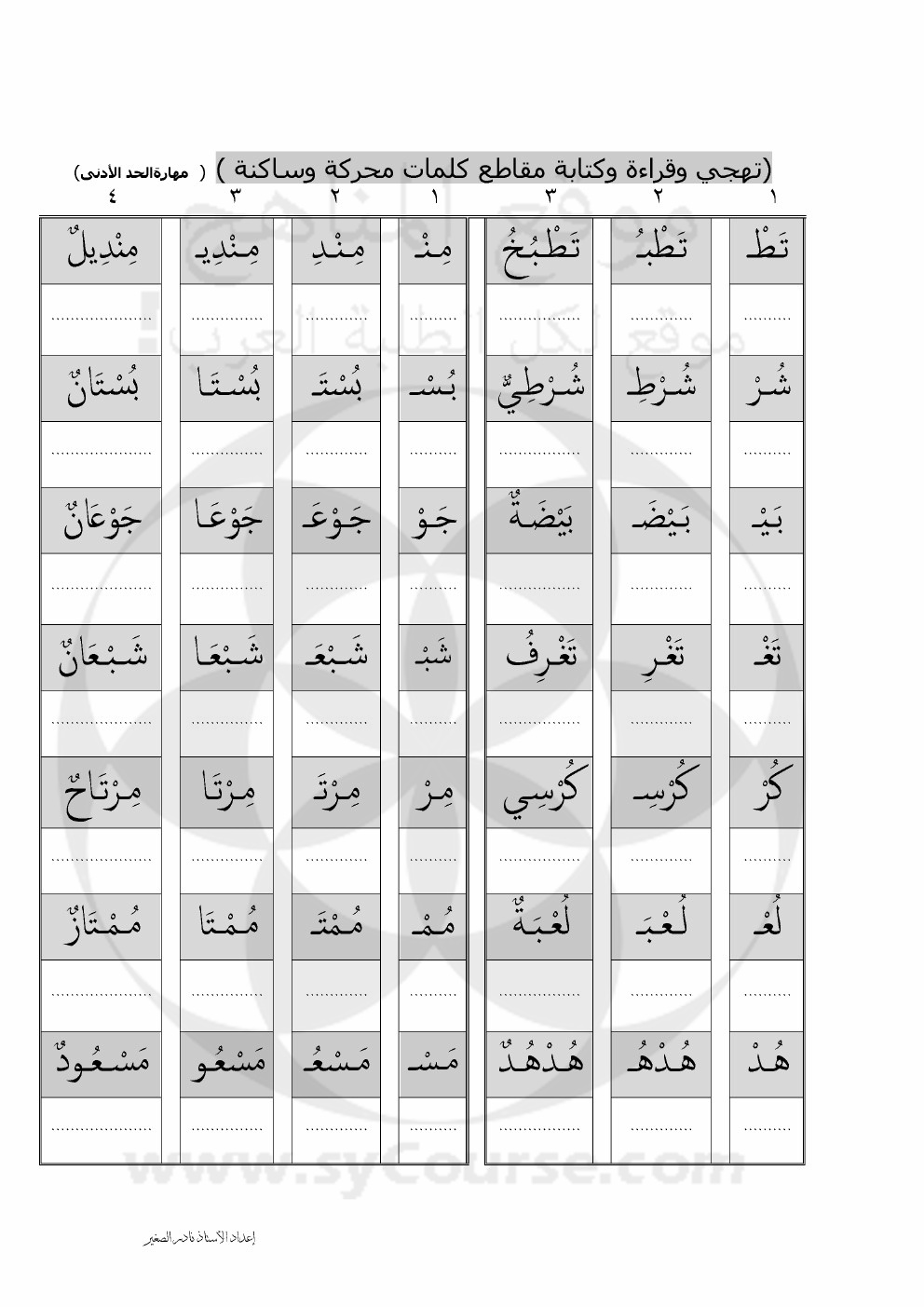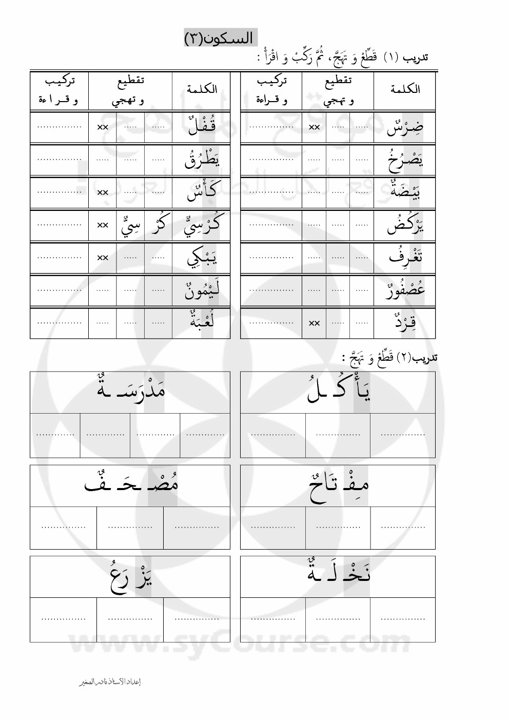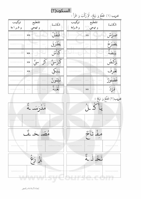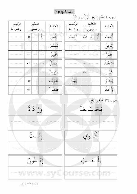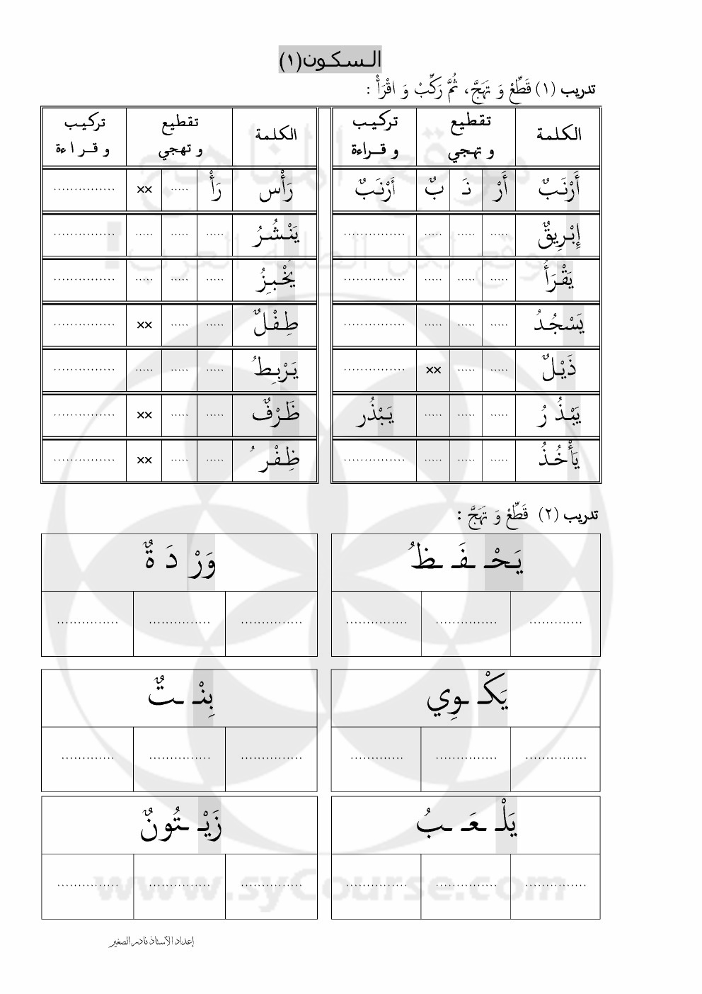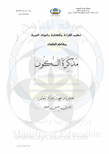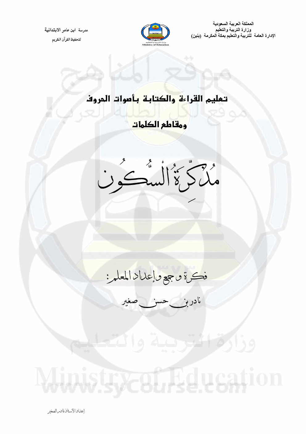 إليكم ملف لتعليم القراءة والكتابة بأصوات الحروف ومقاطع الكلمات(مذكرة السكون) مكوّن من 11 صفحة من إعداد المعلم: نادر بن حسن صغير من مدرسة ابن عامر الابتدائية لتحفيظ القرآن الكريم