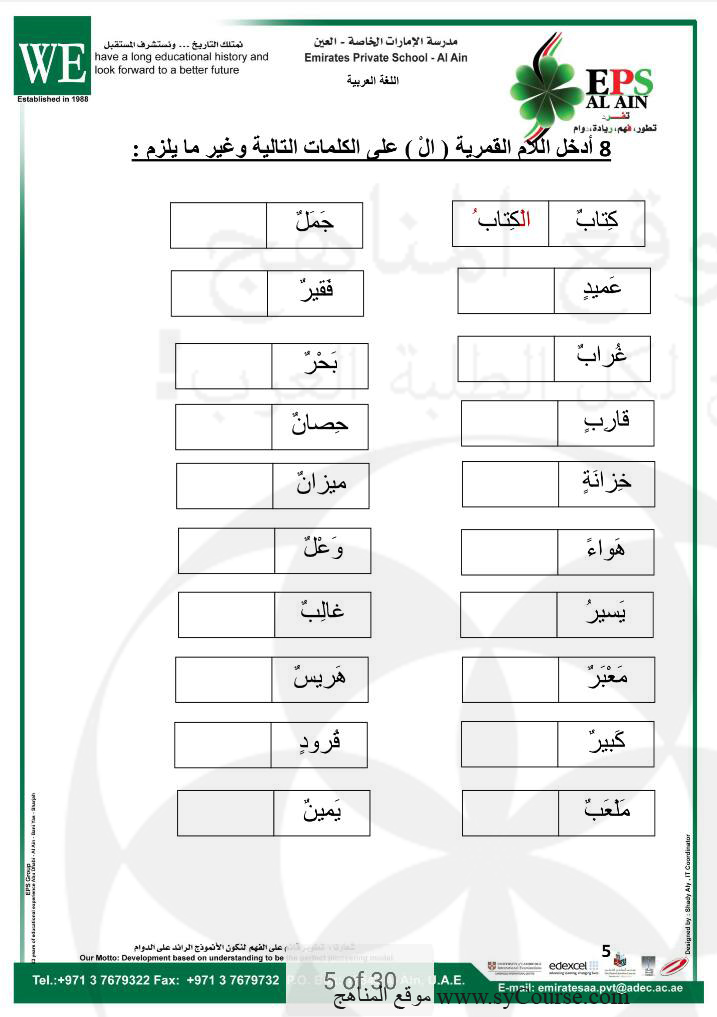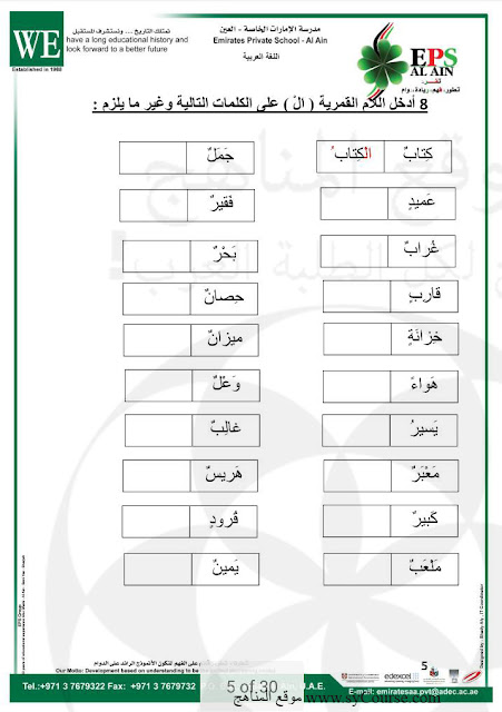 إليكم أوراق عمل في اللغة العربية للصف الأول - الفصل الثاني من العام الدراسي 2016-2017 وذلك وفق المنهاج الاماراتي: تتضمن الأوراق تحليل الكلمات واللام القمرية وأضداد الكلمات تكون | ||
