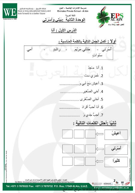 | أوراق عمل الوحدة الثانية بيتي وأسرتي ـ صور | ||