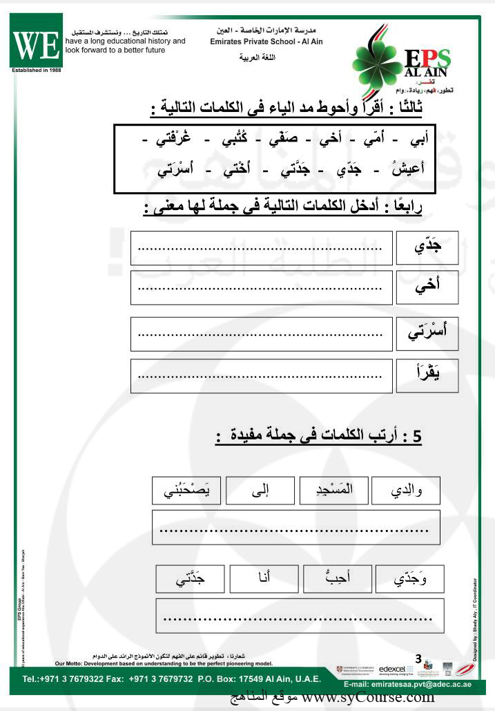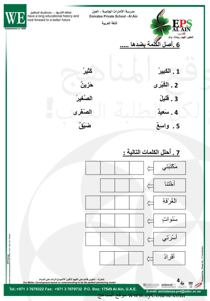 إليكم أوراق عمل في اللغة العربية للصف الأول - الفصل الثاني من العام الدراسي 2016-2017 وذلك وفق المنهاج الاماراتي: تتضمن الأوراق تحليل الكلمات واللام القمرية وأضداد الكلمات تكون |
