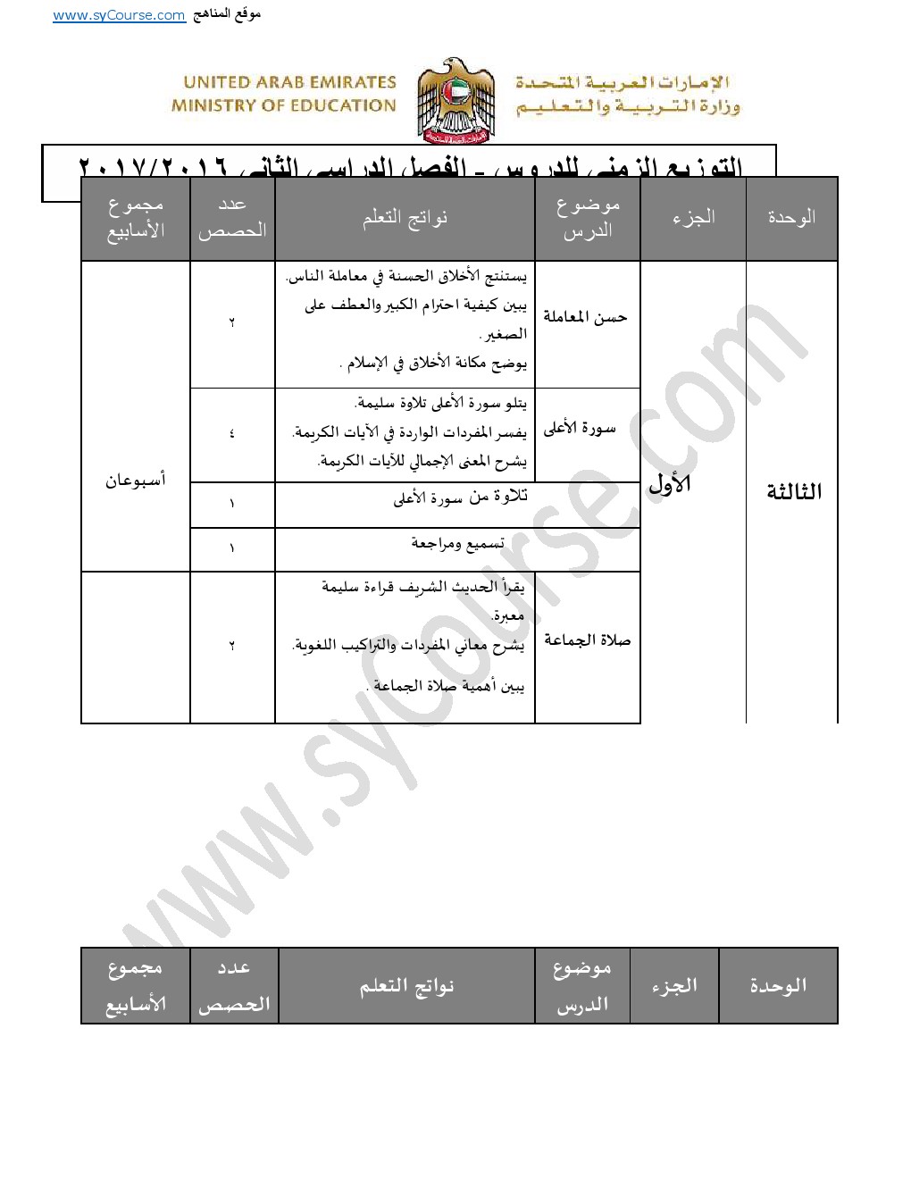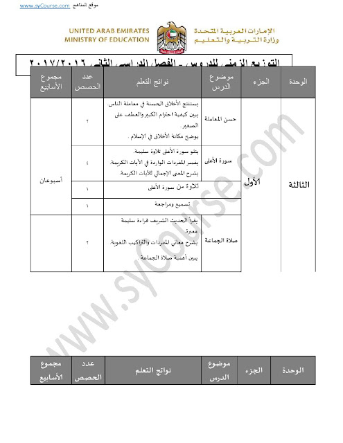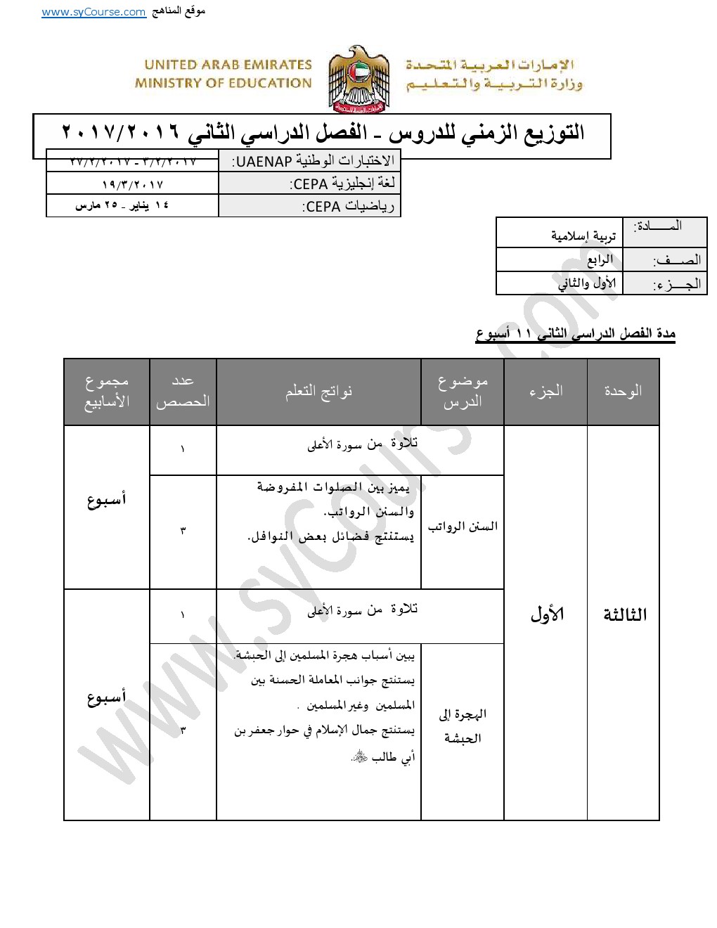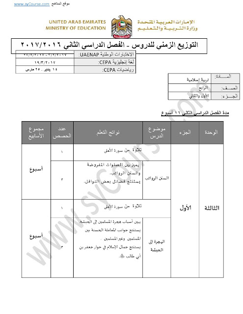 معلومات الملف: الصف الرابع, الفصل الثاني, تربية اسلامية, التوزيع الزمني لدروس الفصل الثاني 2016-2017 | ||