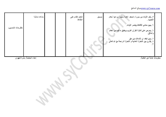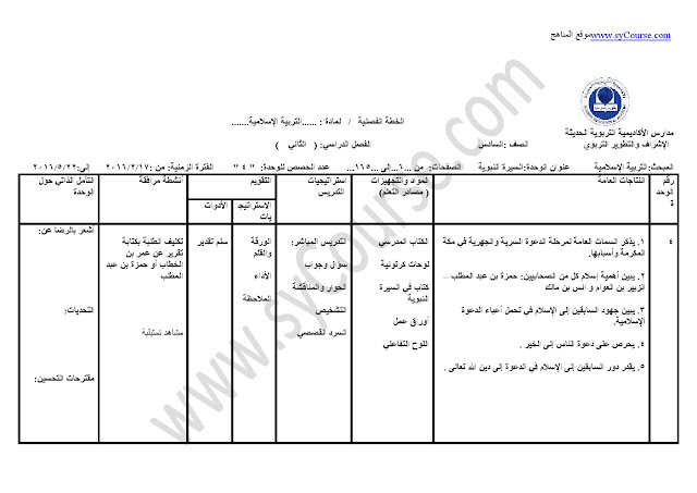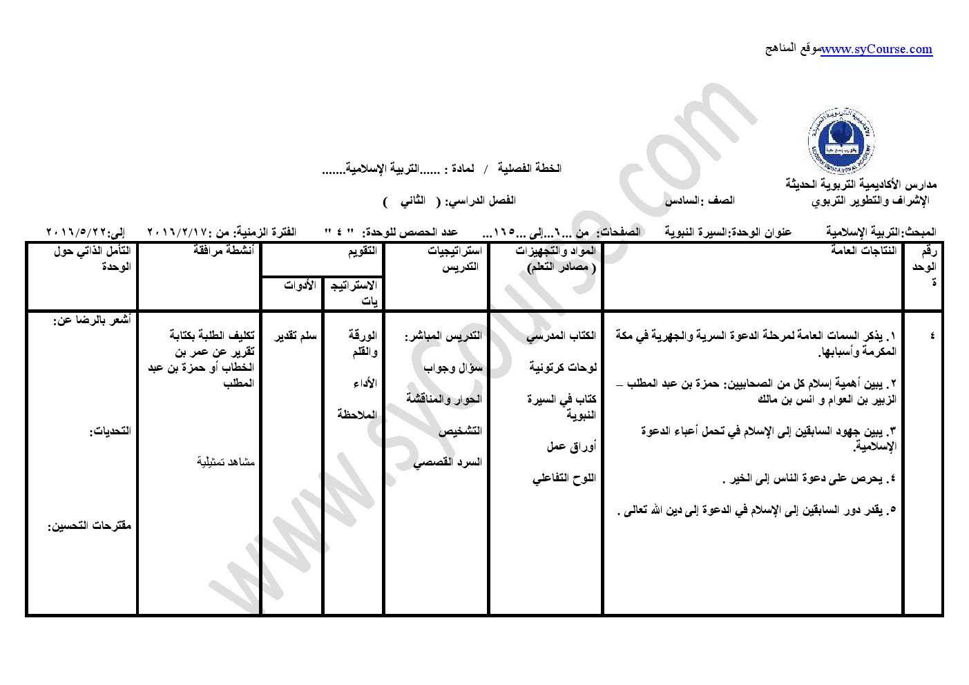 معلومات الملف: الصف السادس, الفصل الثاني, تربية اسلامية, الخطة الفصلية للعام الدراسي 2016-2017 | ||