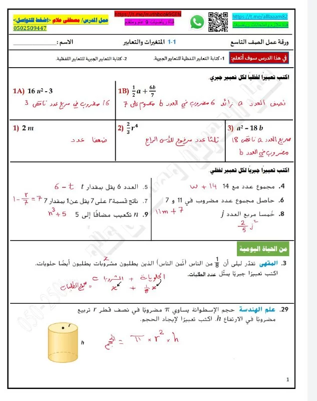 حل أوراق عمل الوحدة الأولى التعابير والمعادلات والدوال - إعداد: مصطفى أسامة علام | ||