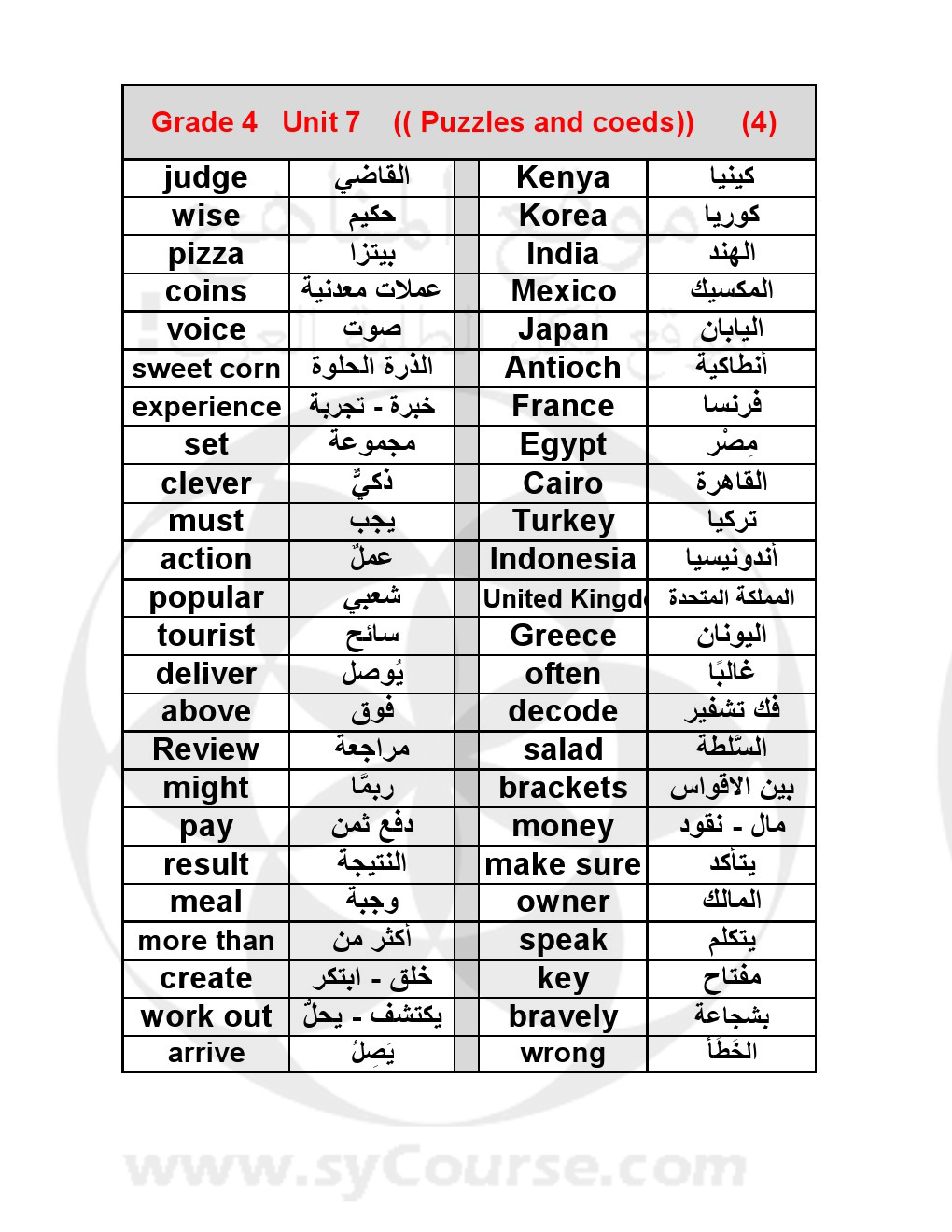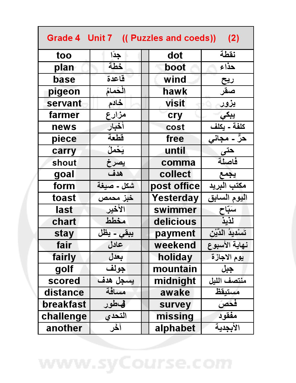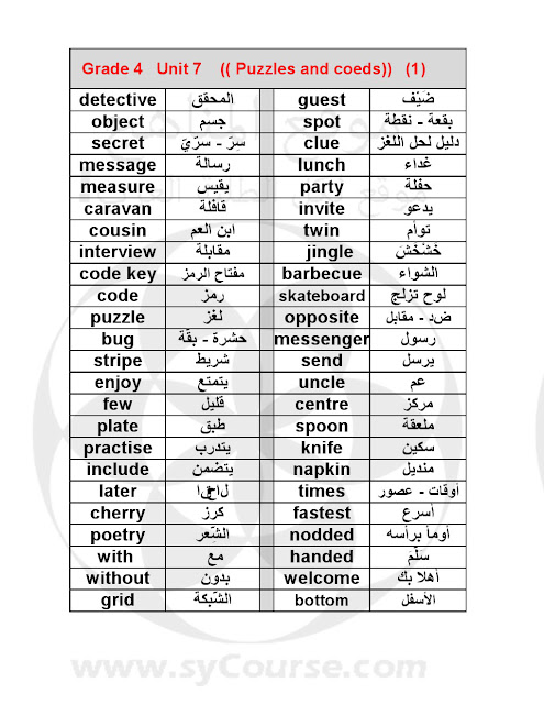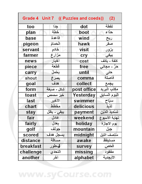 معلومات الملف: الصف الرابع, الفصل الثاني, لغة انكليزية, مقردات الوحدة السابعة مع الترجمة | ||