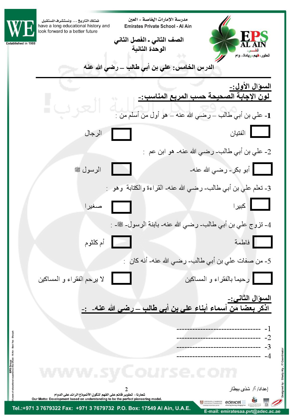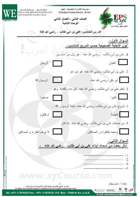 يقدم لكم موقع المناهج الاماراتية بالتعاون مع (مدرسة الامارات الخاصة- العين) أوراق عمل في مادة التربية الاسلامية للصف الثاني- الفصل الثاني من العام الدراسي 2016-2017