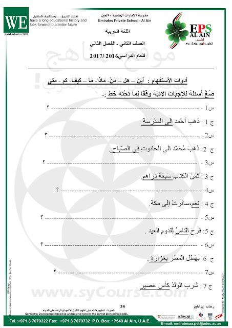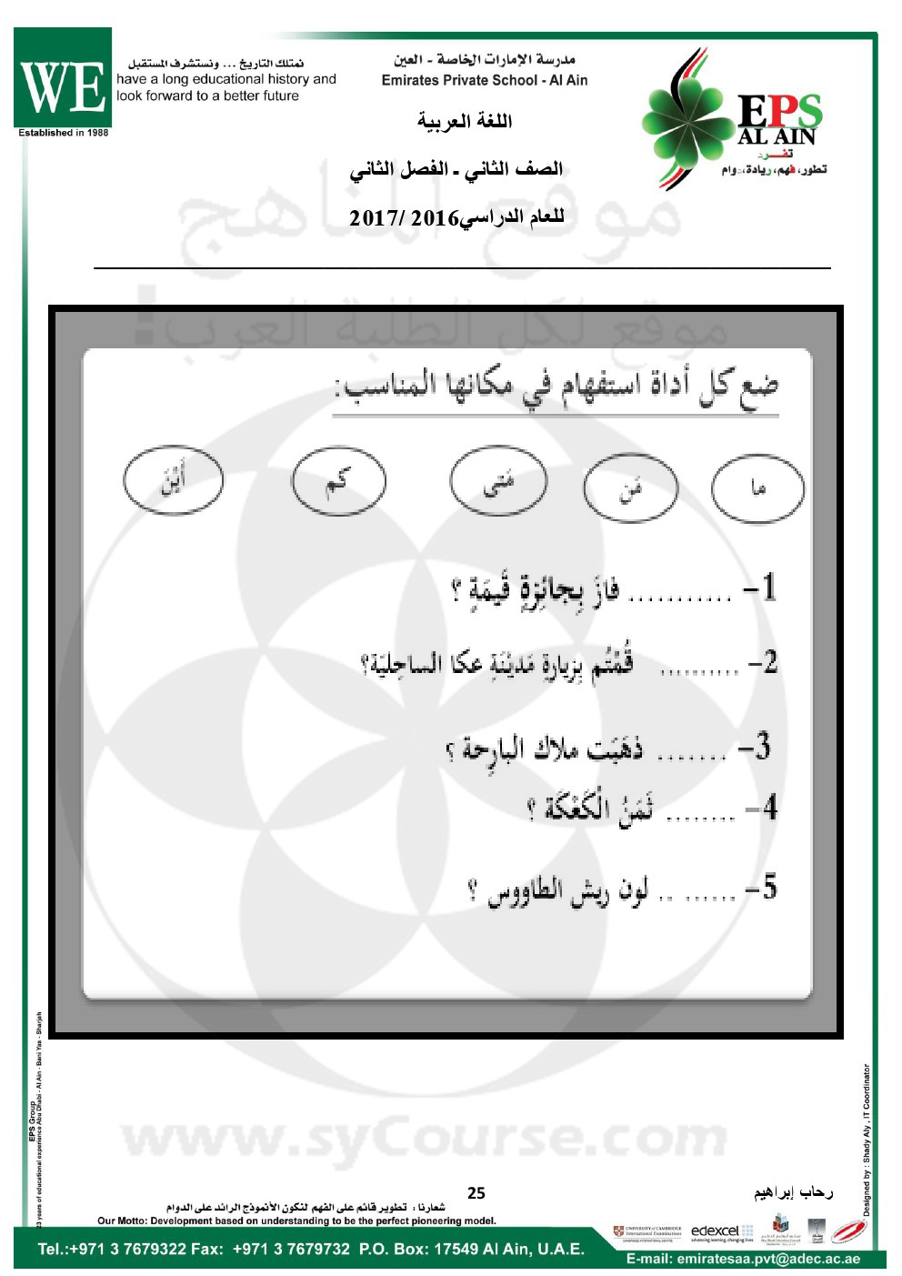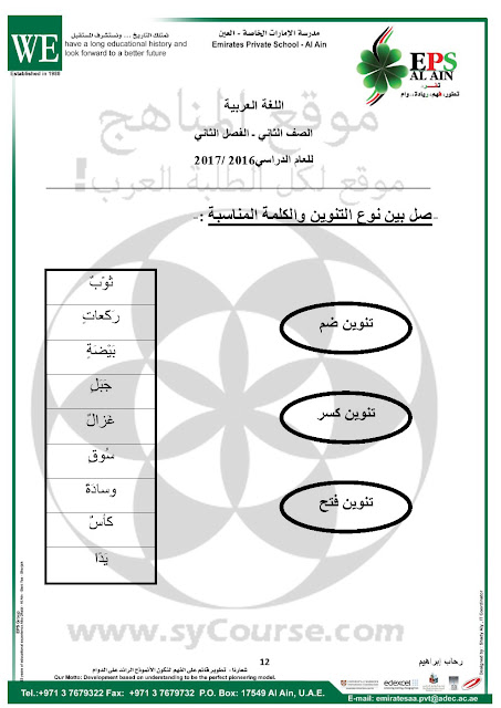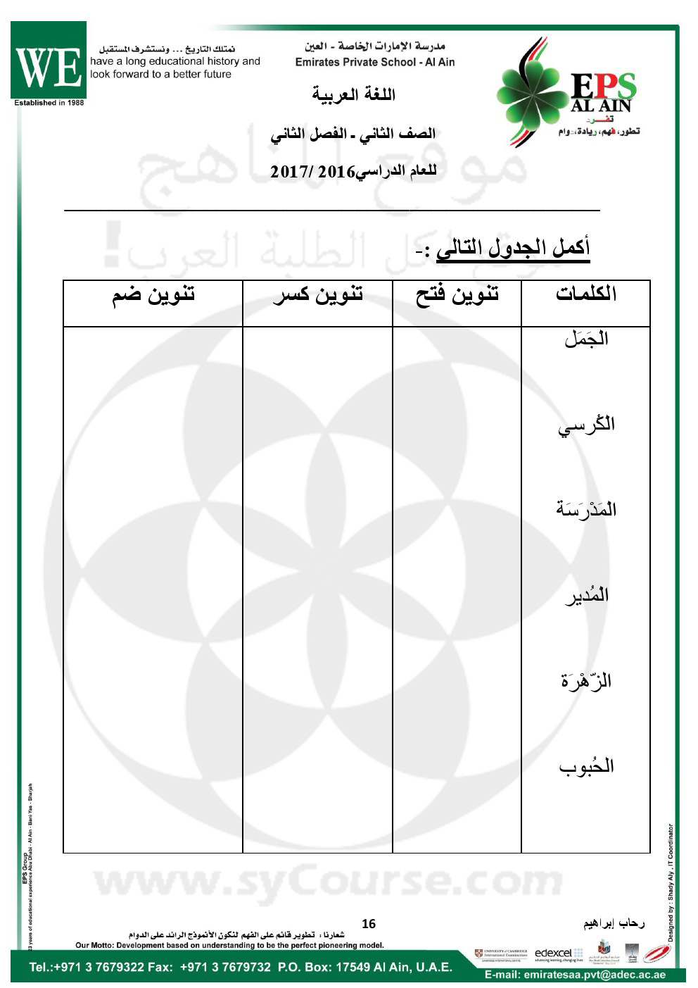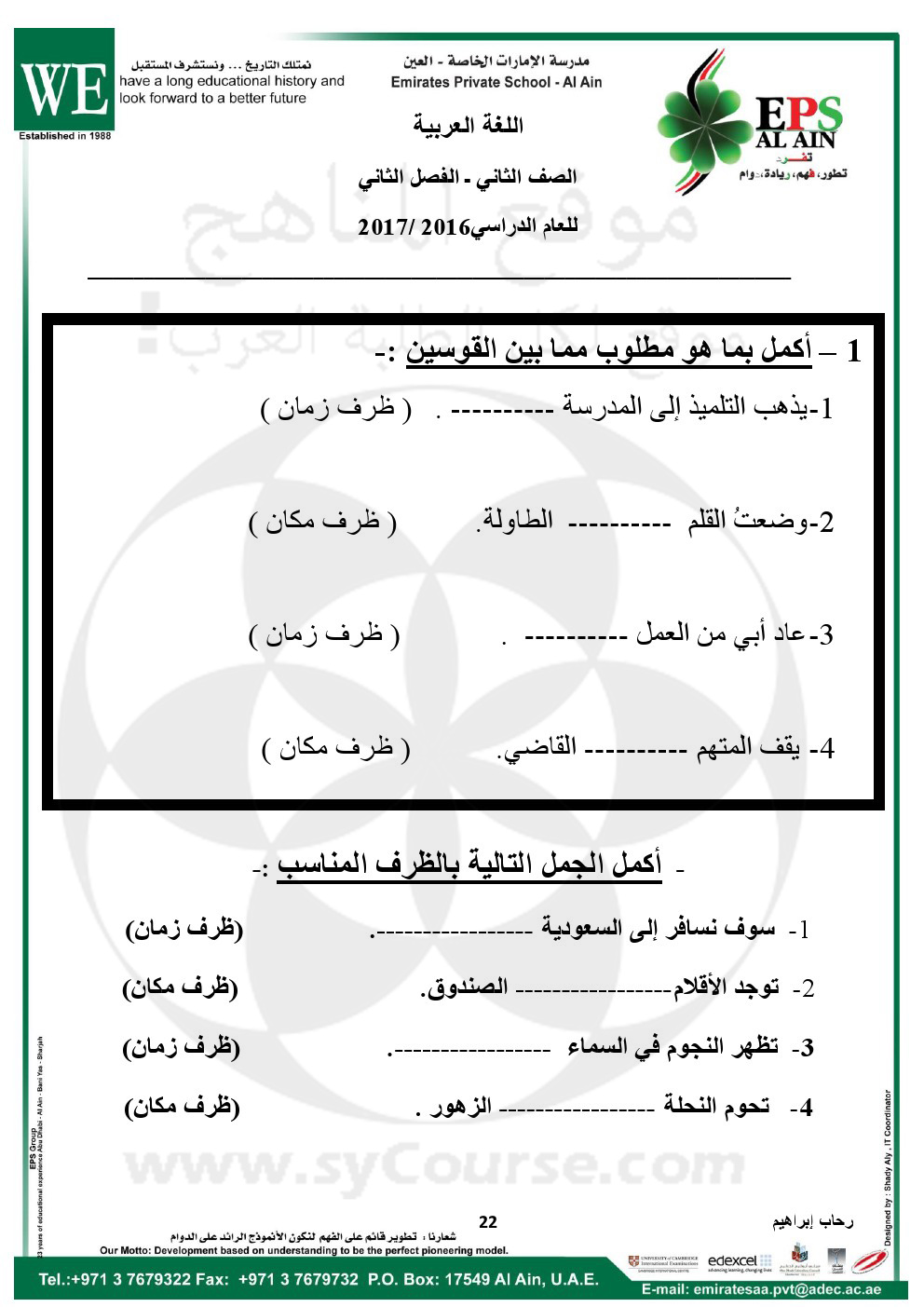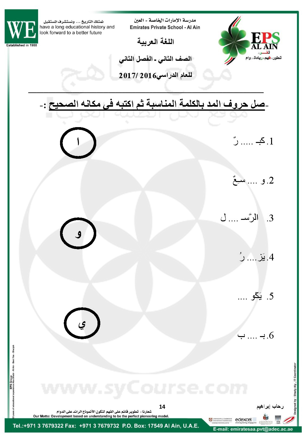 يقدم لكم موقع المناهج بالتعاون مع مدرسة (الامارات الخاصة) أوراق عمل في اللغة العربية - الفصل الثاني من العام الدراسي 2016-2017