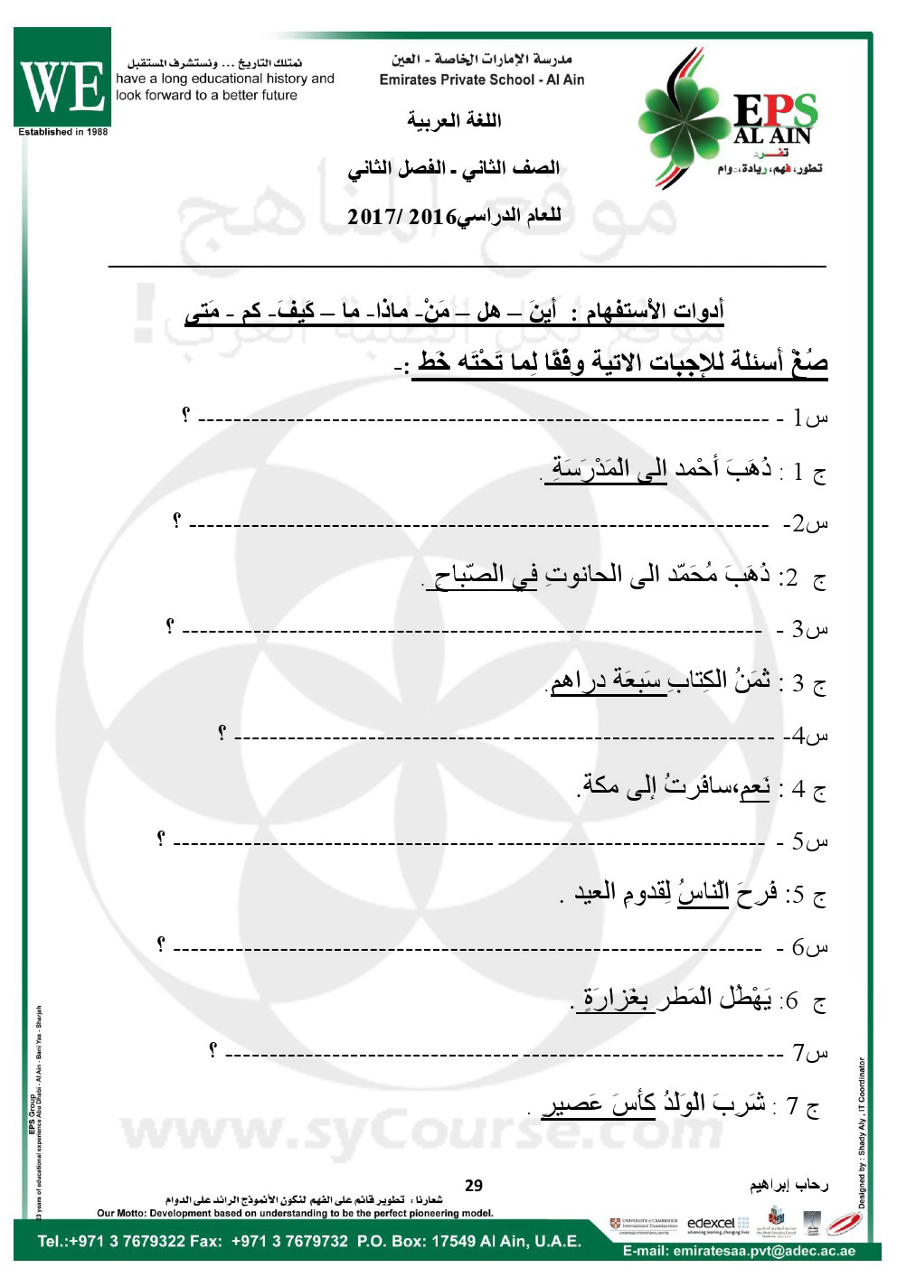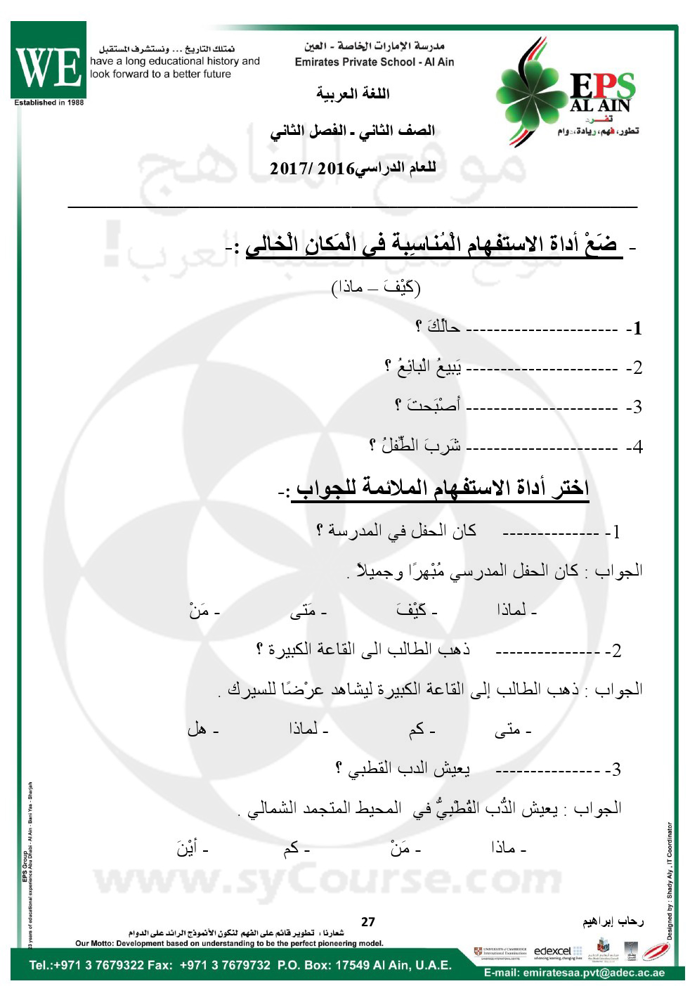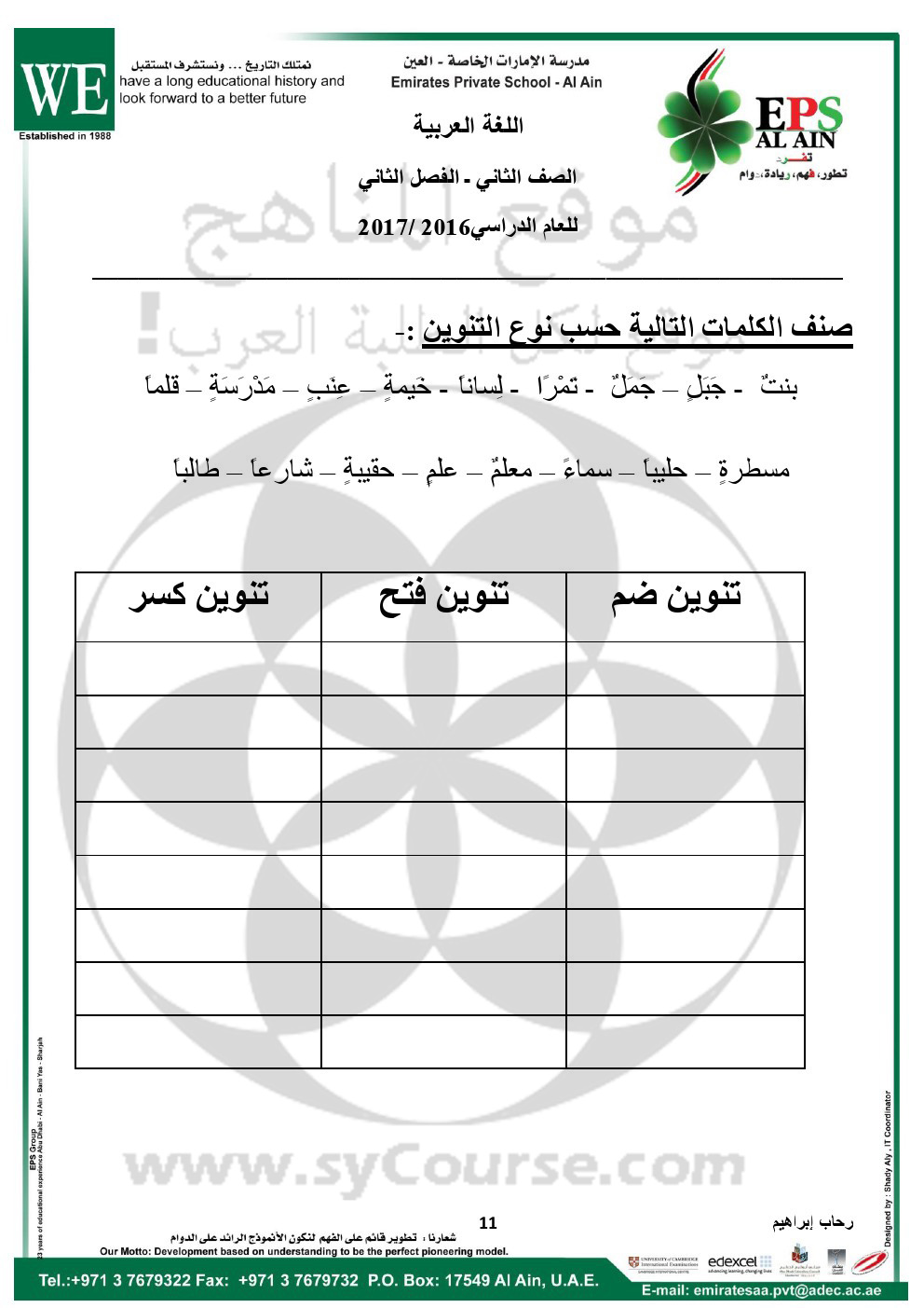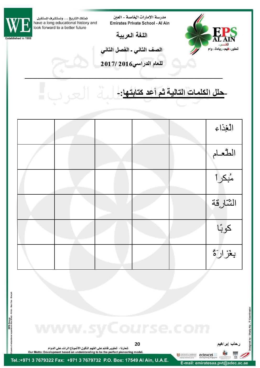 يقدم لكم موقع المناهج بالتعاون مع مدرسة (الامارات الخاصة) أوراق عمل في اللغة العربية - الفصل الثاني من العام الدراسي 2016-2017