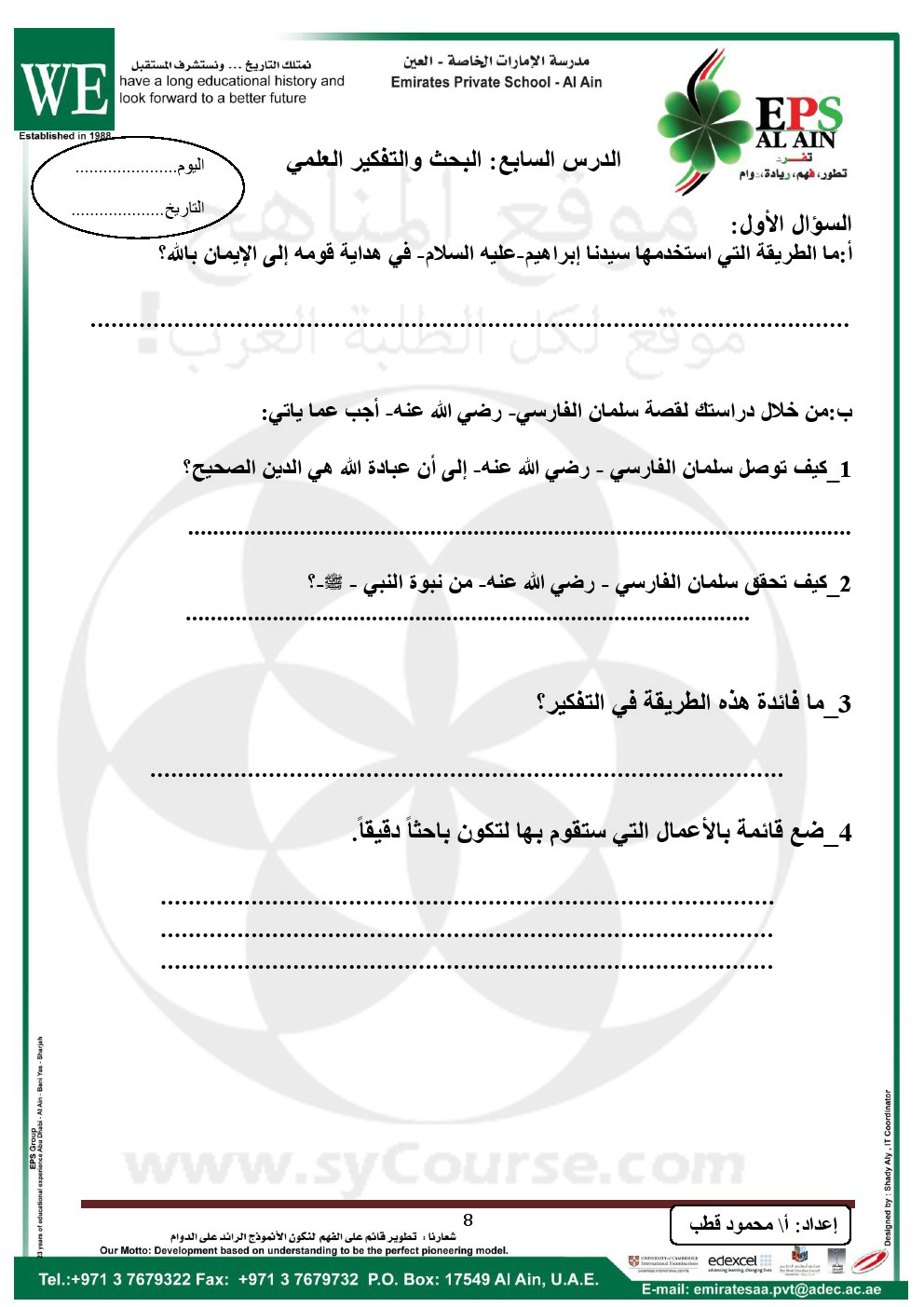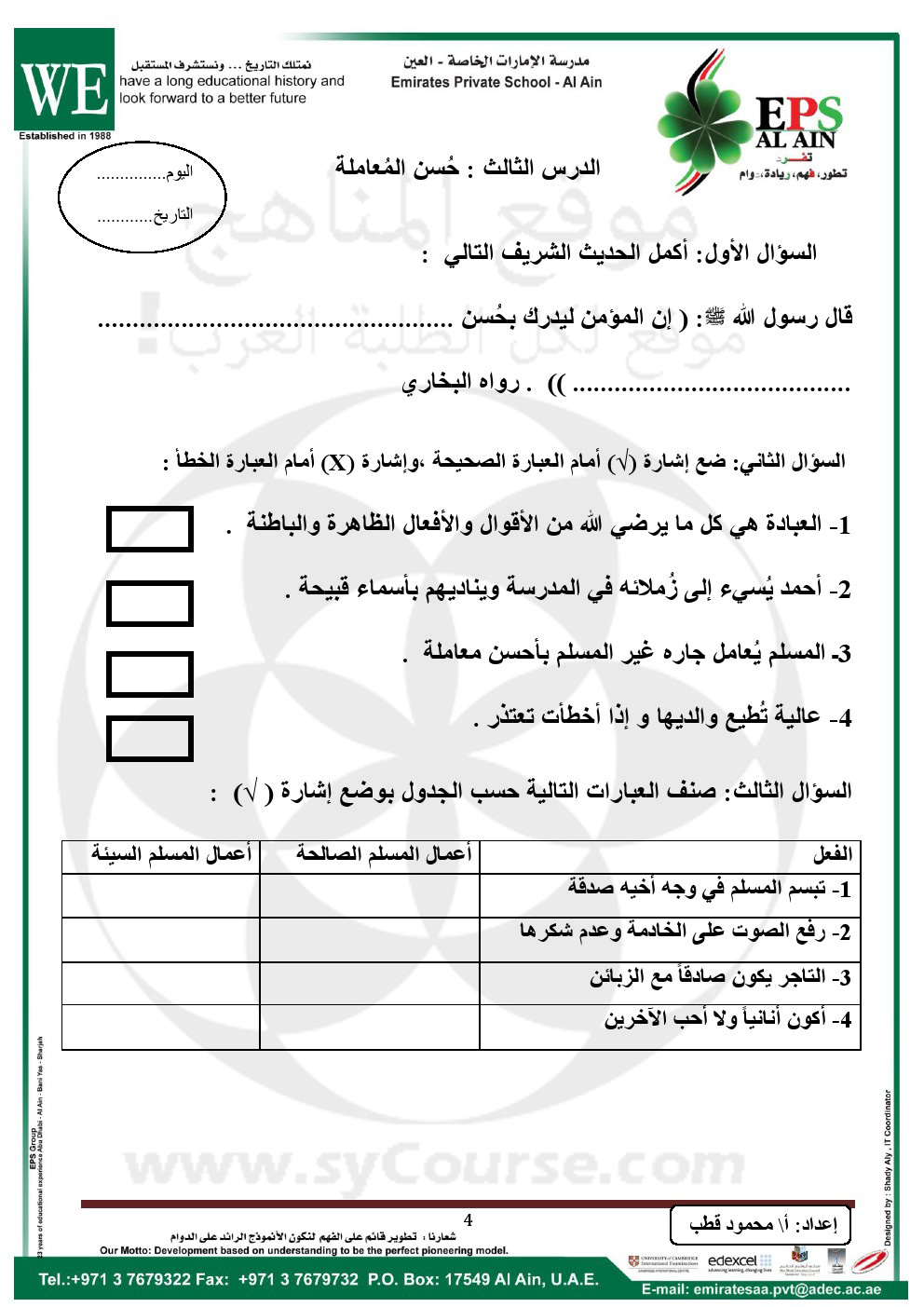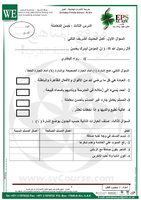يقدم لكم موقع المناهج الاماراتية بالتعاون مع مدرسة الامارات الخاصة أوراق عمل في مادة التربية الاسلامية للصف الرابع - الفصل الدراسي الثاني,<