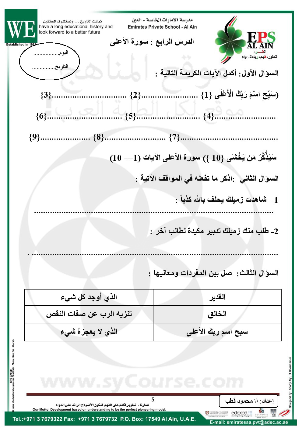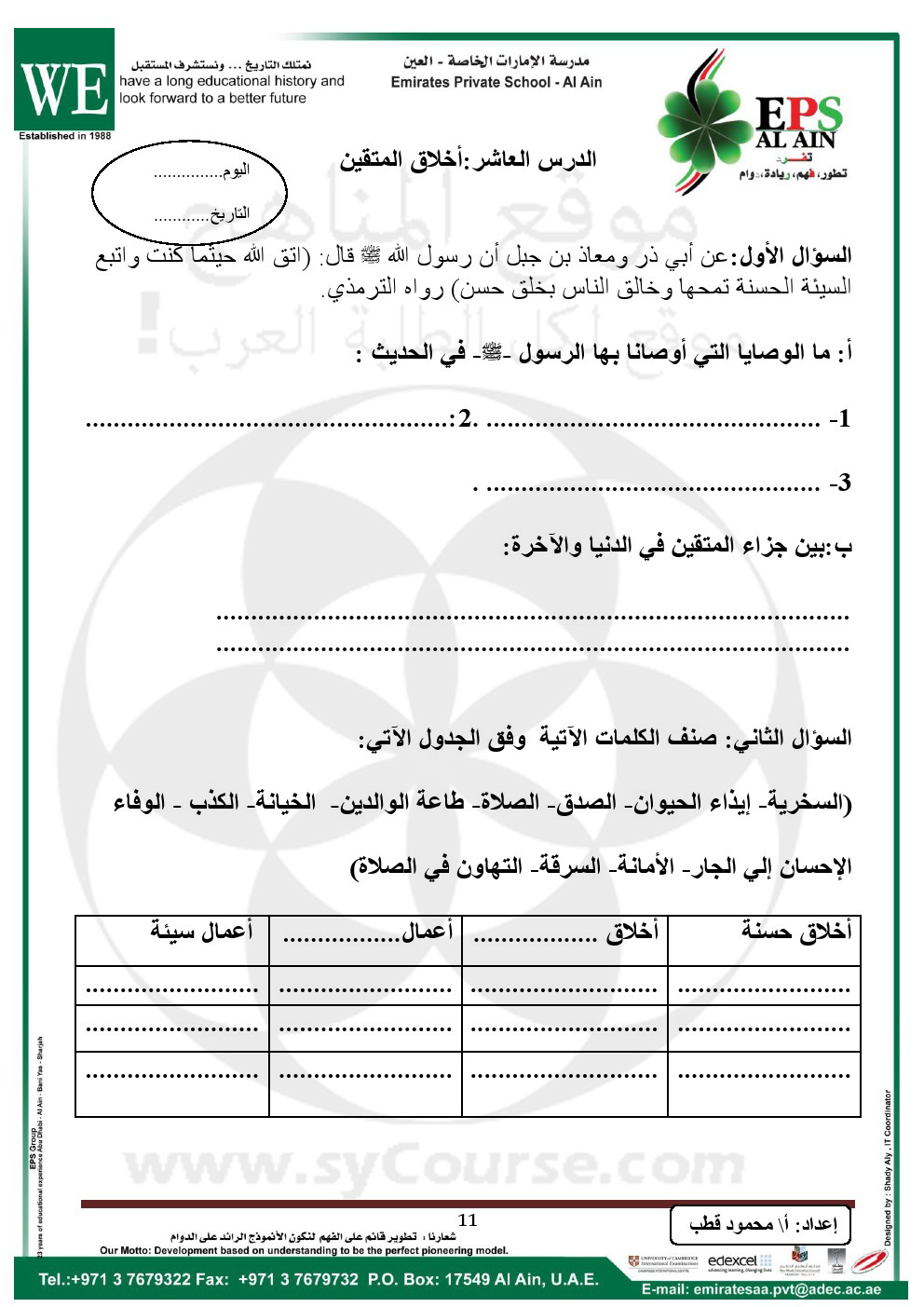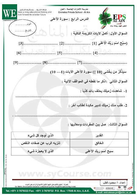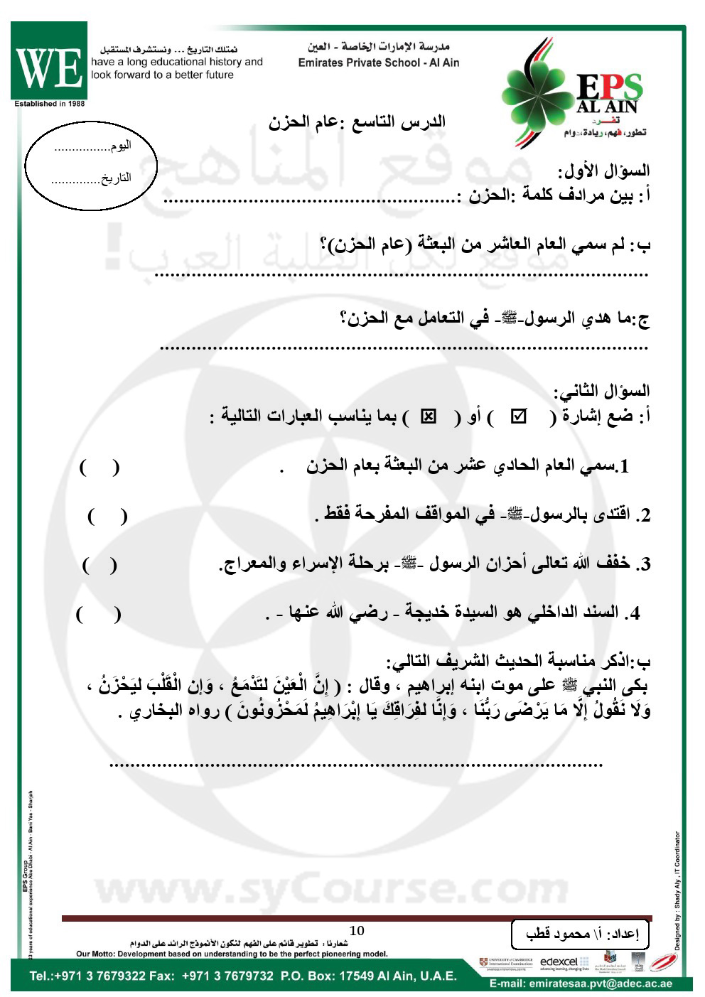 5. الصف التاسع, تربية اسلامية, تدريبات عامة جميع الدروس اختيار من متعدد