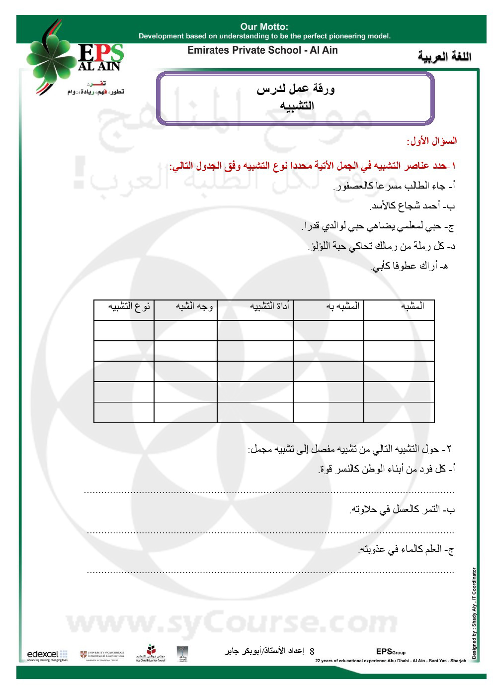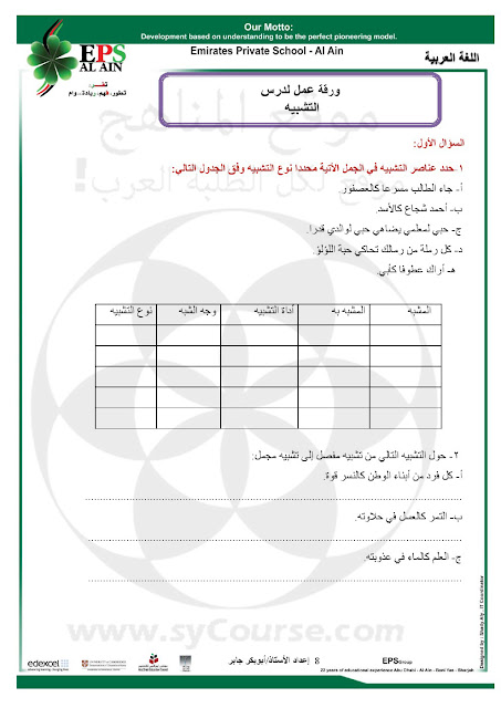 الصف الثامن, الفصل الثاني, لغة عربية, أوراق عمل منتصف الفصل