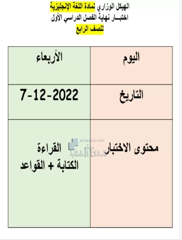 معلومات الملف: نرفق لكم ملف يتضمننموذجأسئلة امتحان وفق الهيكل الوزاري من مادة لغة انجليزية للصف الرابع الفصل الدراسي الأول للعام الدراسي 2022-2023 | ||