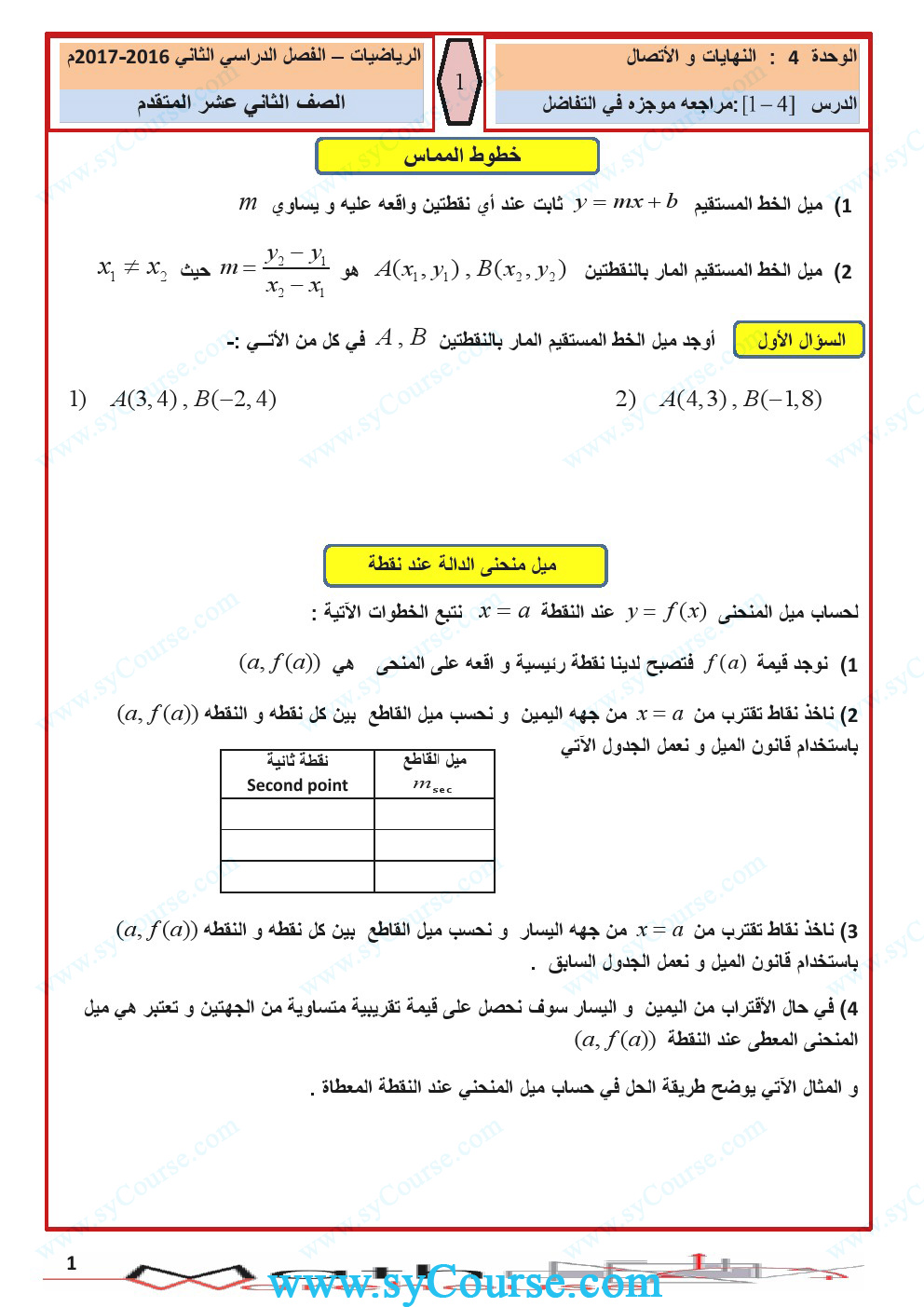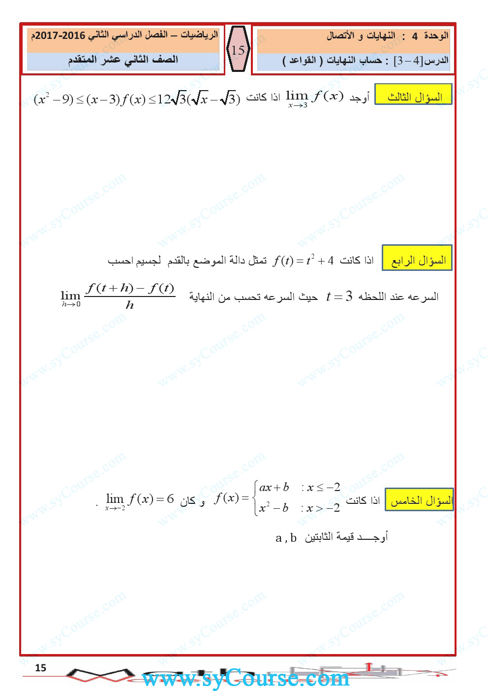 | معلومات الملف: الصف الثاني عشر المتقدم, الفصل الثاني, رياضيات, تدريبات متنوعة مع الشرح على الوحدة الرابعة(النهايات والاتصال) | ||