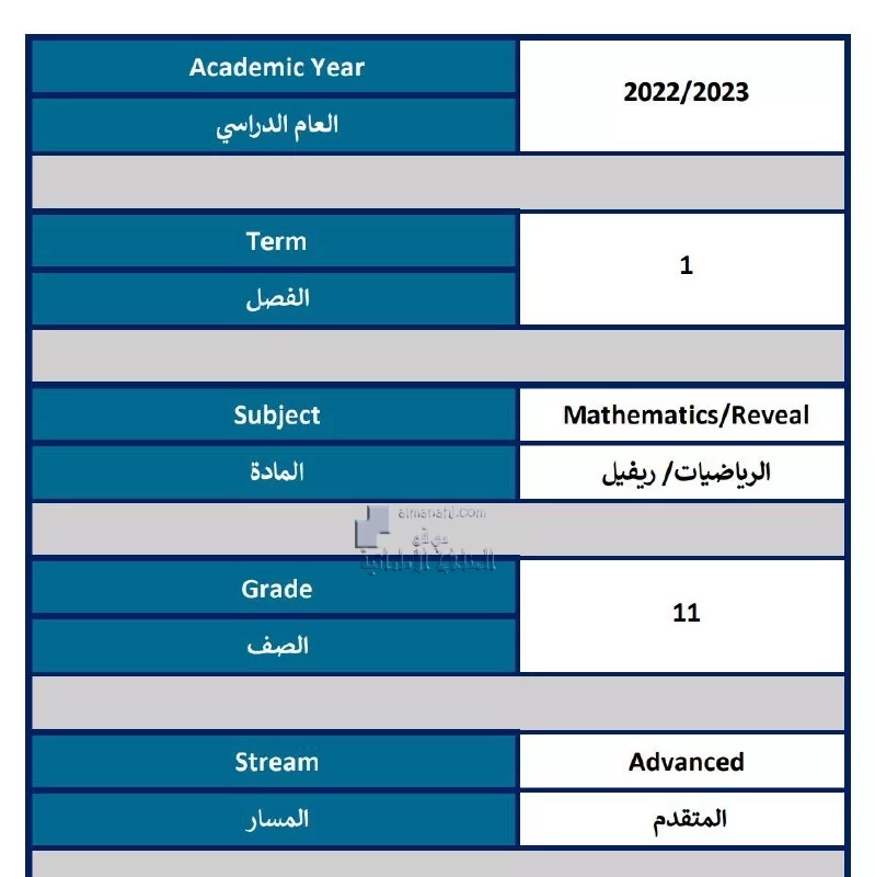 معلومات الملف: نرفق لكم ملف الذي يتضمننموذجالهيكل الوزاري الفصل الأول من مادة الرياضيات للصف الحادي عشر المتقدم منهج ريفيل reveal الفصل الدراسي الأول للعام الدراسي 2022-2023 | ||