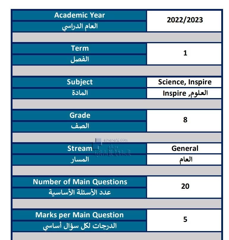 معلومات الملف: نرفق لكم ملف الذي يتضمننموذجالهيكل الوزاري الفصل الأول من مادة العلوم للصف االثامن منهج انسباير Inspire الفصل الدراسي الأول للعام الدراسي 2022-2023 | ||