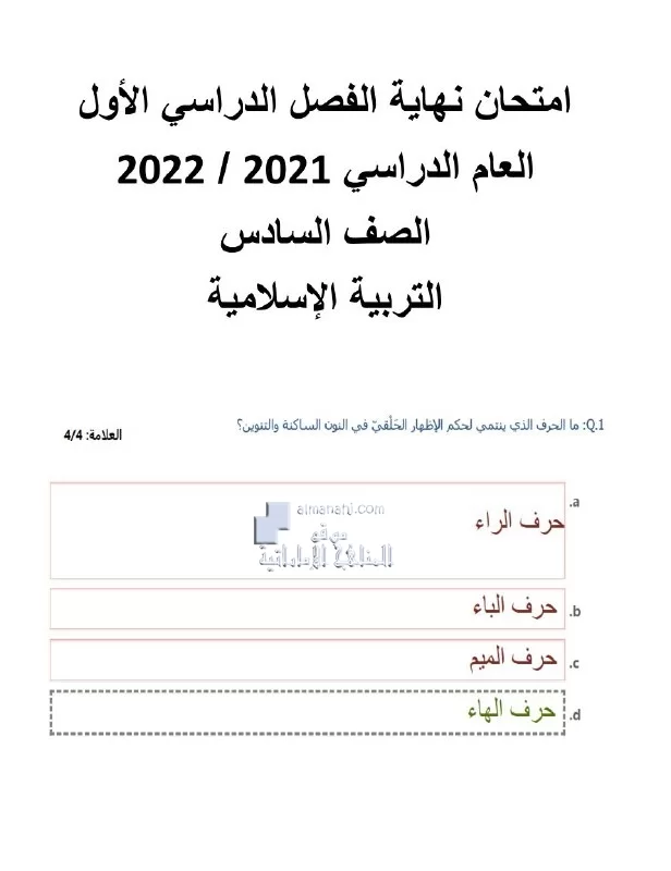 معلومات الملف: نرفق لكم ملف يتضمن حل أسئلة الامتحان النهائي للفصل الأول من مادة التربية الإسلامية للصف السادس الفصل الدراسي الأول للعام الدراسي 2022-2021 | ||