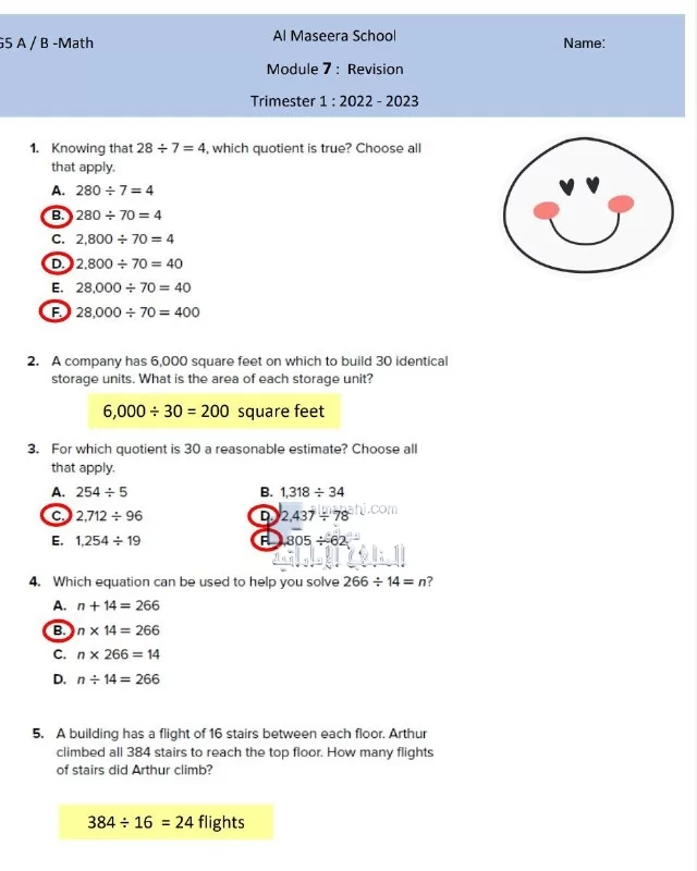 1. حل مراجعة الوحدة الثانية القسمة على عدد مكون من رقم واحد