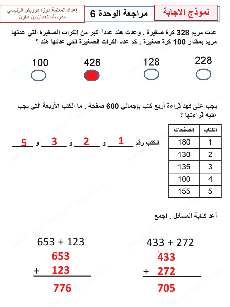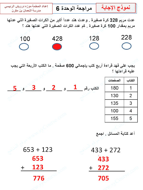 6. مذكرة الوحدة السادسة جمع الأعداد المكونة من ثلاثة أرقام