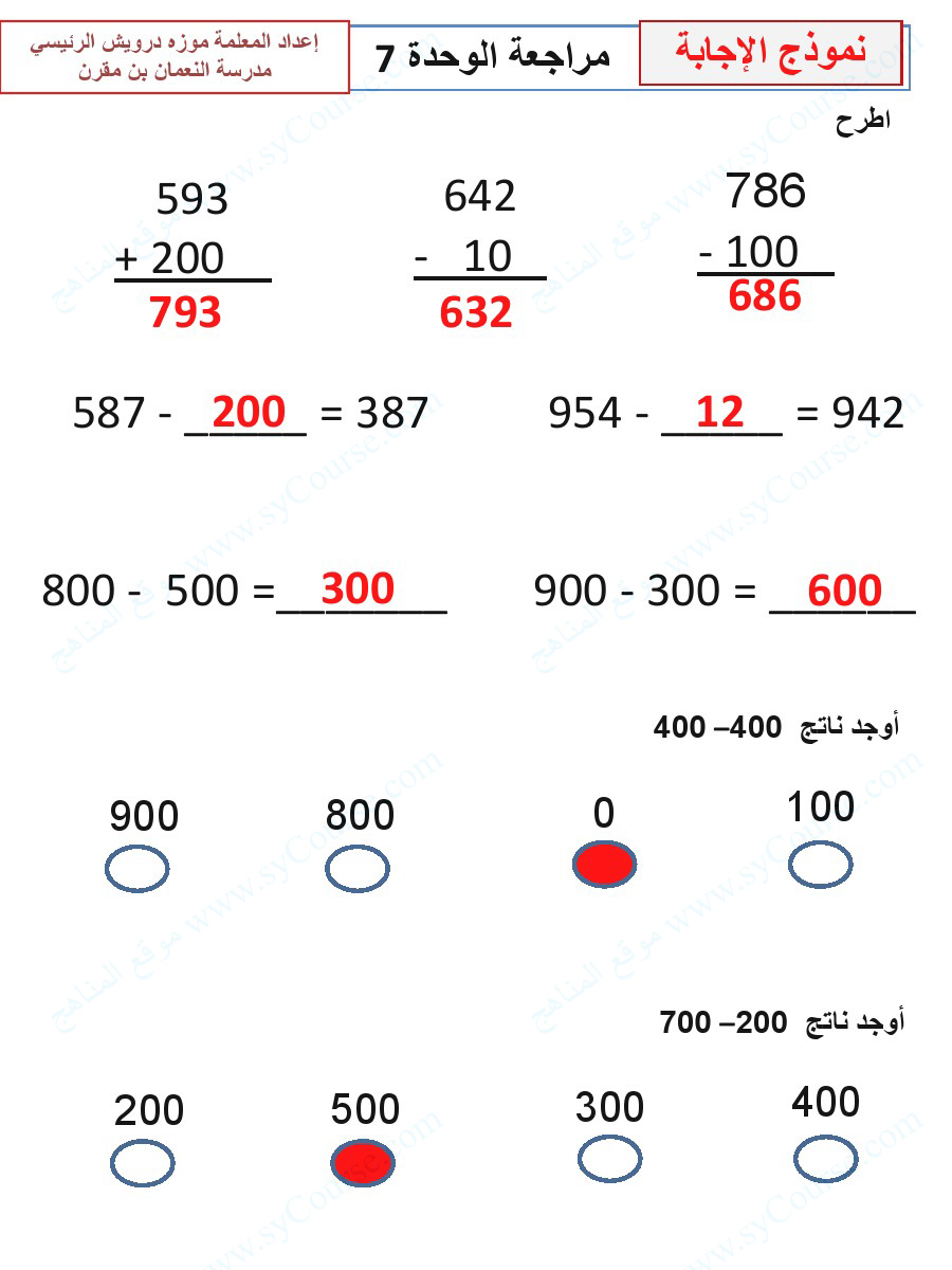 5. مذكرة الوحدة السابعة طرح الأعداد المكونة من ثلاثة أرقام