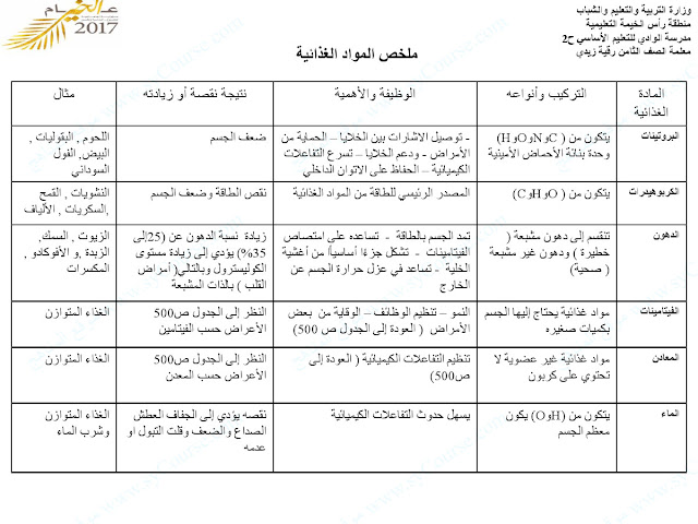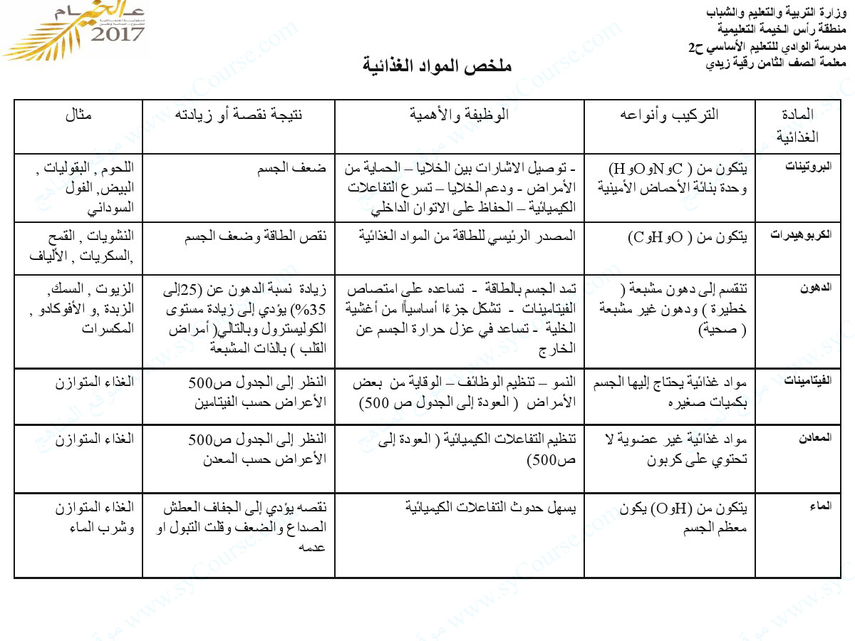 معلومات الملف: الصف الثامن, الفصل الثاني, علوم, ملخص المواد الغذائية | ||