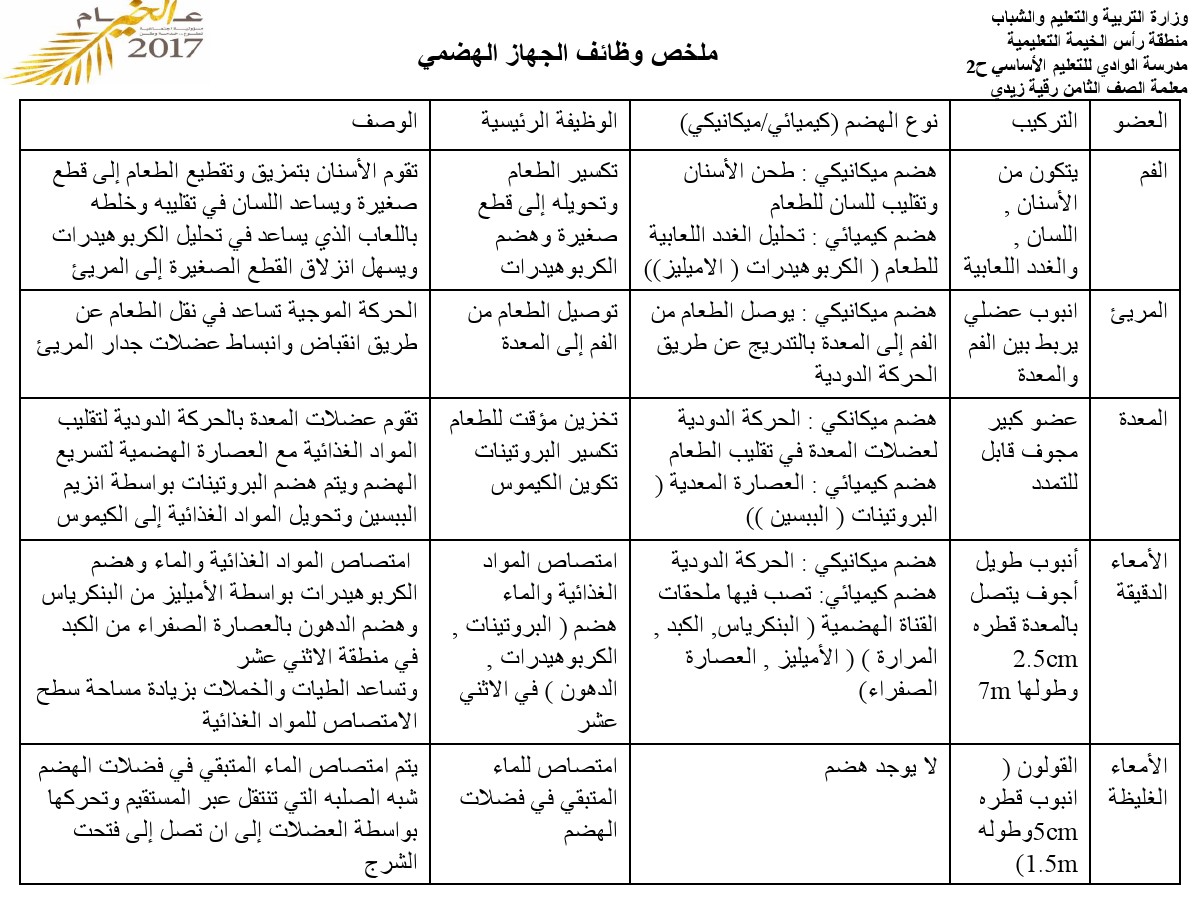 معلومات الملف: الصف الثامن, الفصل الثاني, علوم., ملخص وظائف الجهاز الهضمي | ||