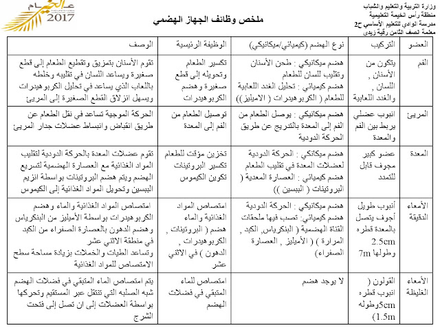 علوم. ملخص وظائف الجهاز الهضمي | ||