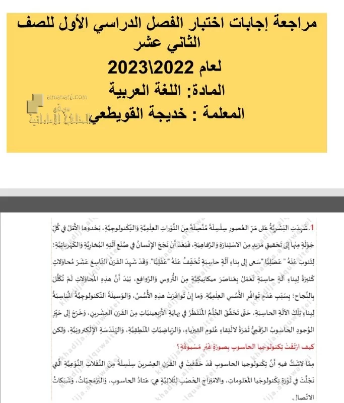 معلومات الملف: نرفق لكم ملف يتضمن حل أسئلة الامتحان النهائي (مراجعة إجابات اختبار الفصل الأول) من مادة اللغة العربية للصف الثاني عشر الفصل الدراسي الأول للعام الدراسي 2022-2023. | ||
