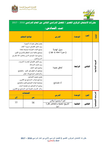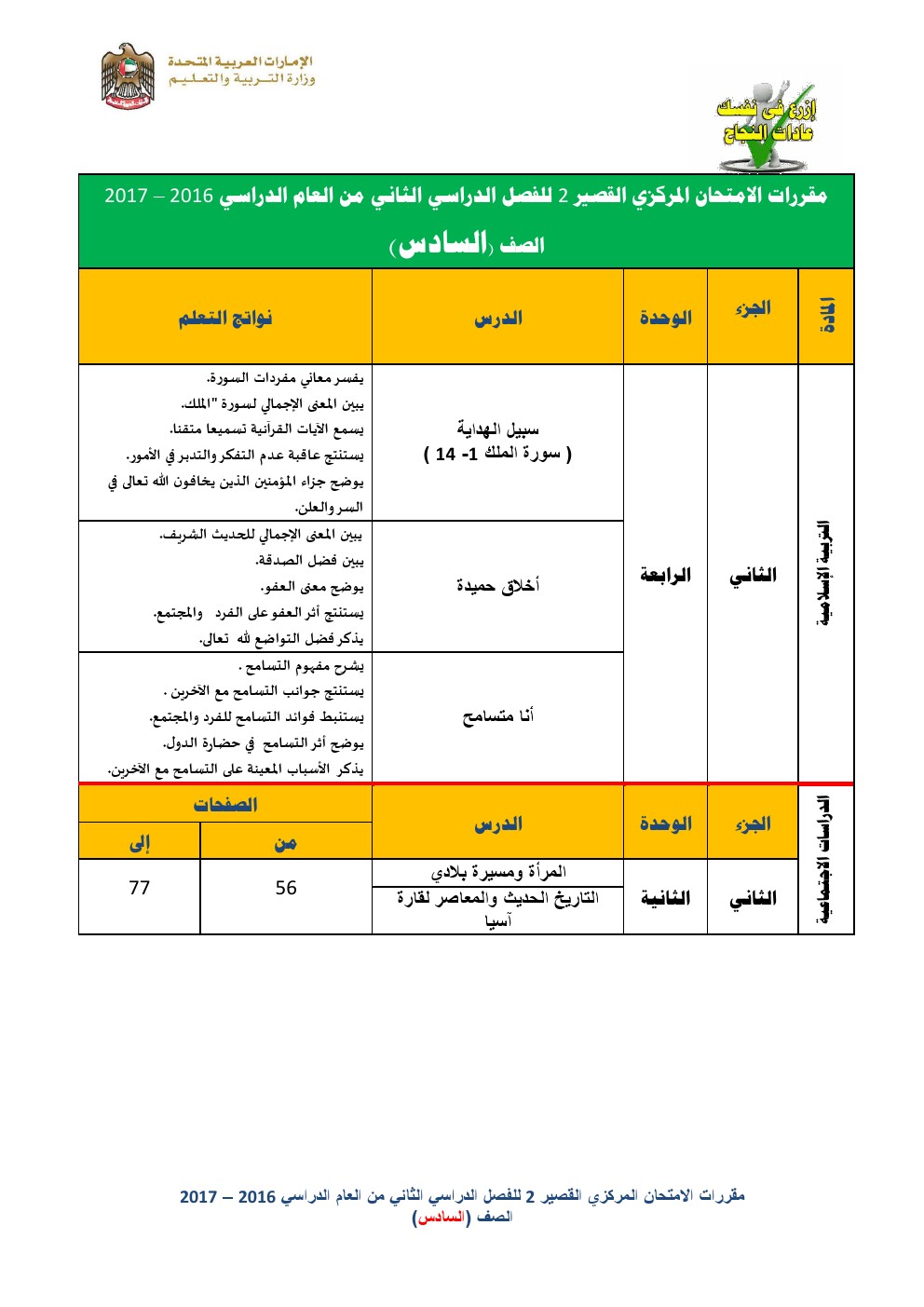 معلومات الملف: الصف السادس- الفصل الثاني- تربية اسلامية واجتماعيات- مقررات الامتحان المركزي القصير2016-2017 | ||