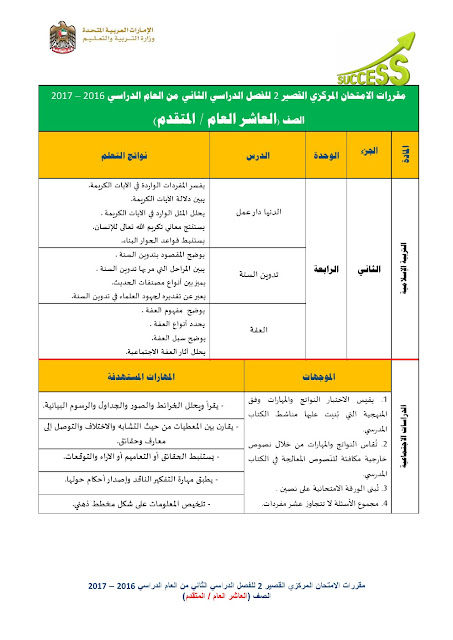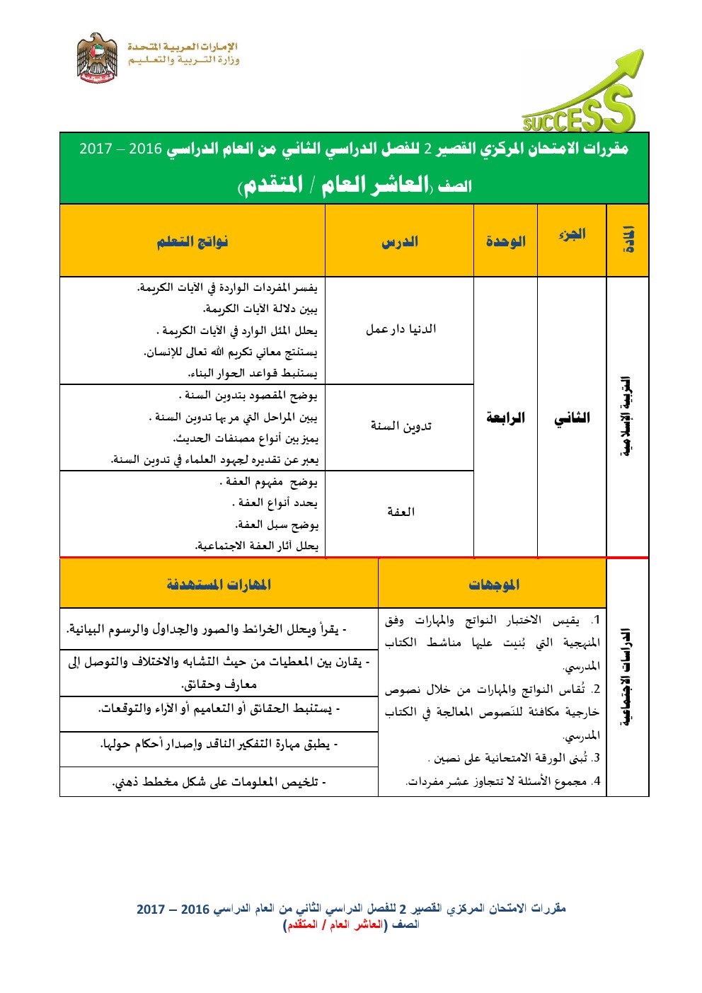 | الصف العاشر الفصل الثاني تربية اسلامية واجتماعيات مقررات الامتحان المركزي القصير | ||