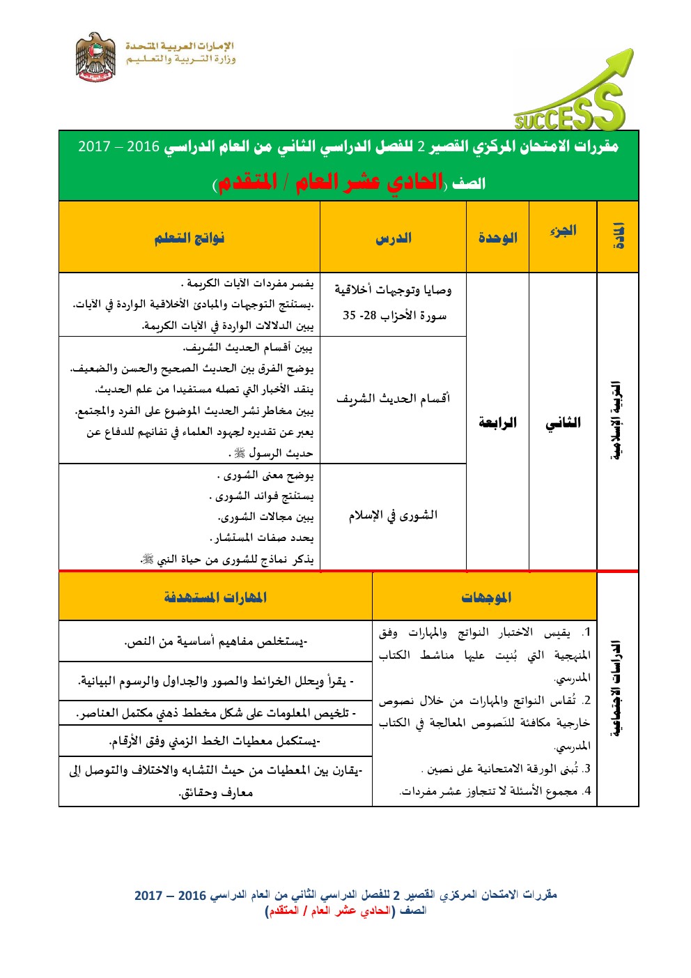 معلومات الملف: الصف الحادي عشر العام والمتقدم- الفصل الثاني- تربية اسلامية واجتماعيات- مقررات الامتحان المركزي القصير2016-2017 | ||
