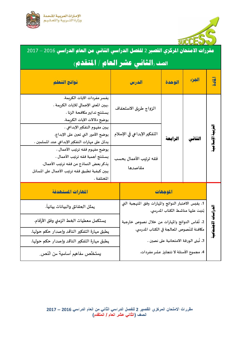 معلومات الملف: الصف الثاني عشر العام والمتقدم- الفصل الثاني- تربية اسلامية واجتماعيات- مقررات الامتحان المركزي القصير2016-2017 | ||