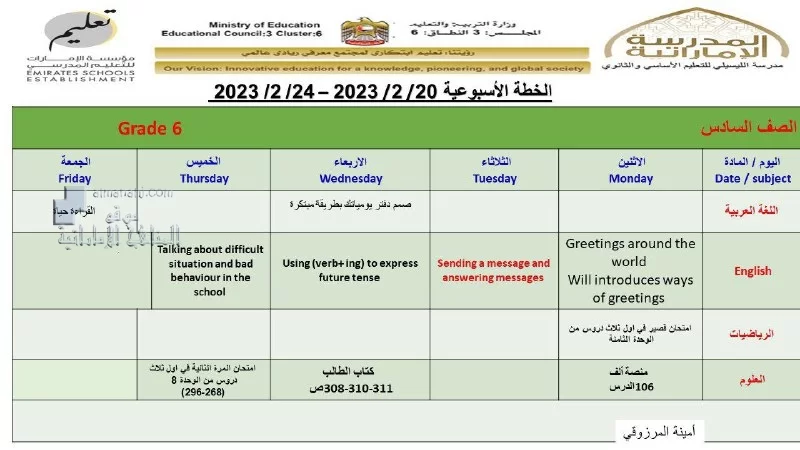 تم إيجاد الملف: الخطة الأسبوعية للصف السادس في مدرسة الليسيلي للتعليم الأساسي والثانوي