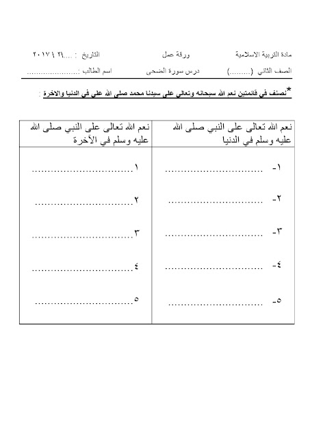 الصف الثاني, الفصل الثاني, تربية اسلامية, ورقة عمل سورة الضحى 2017