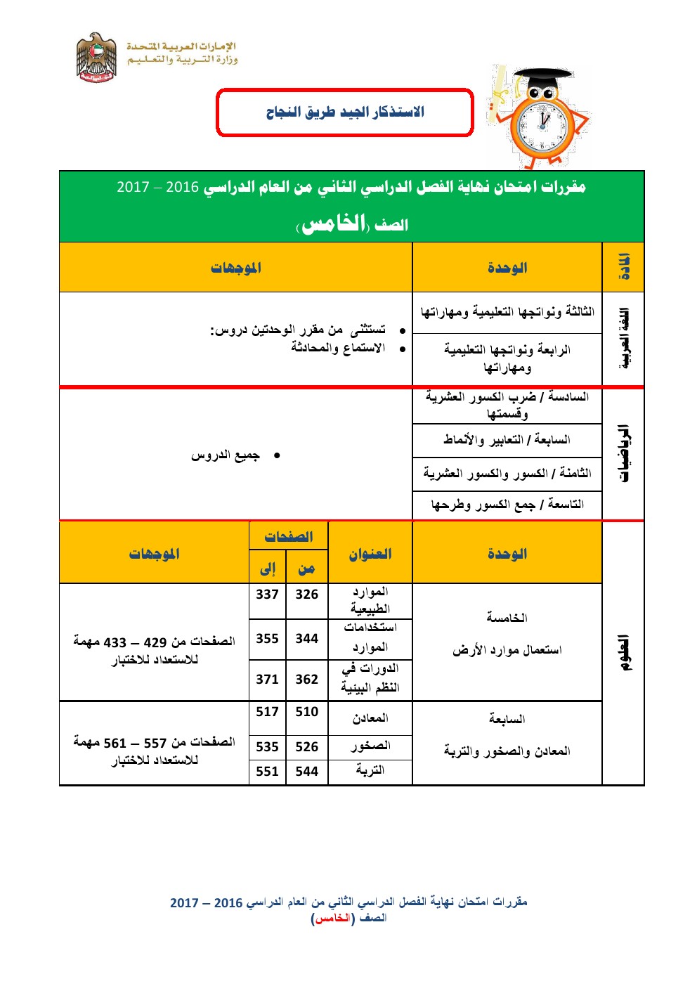 معلومات الملف: الصف الخامس, مقررات امتحان نهاية الفصل الثاني من العام الدراسي 2016-2017 | ||