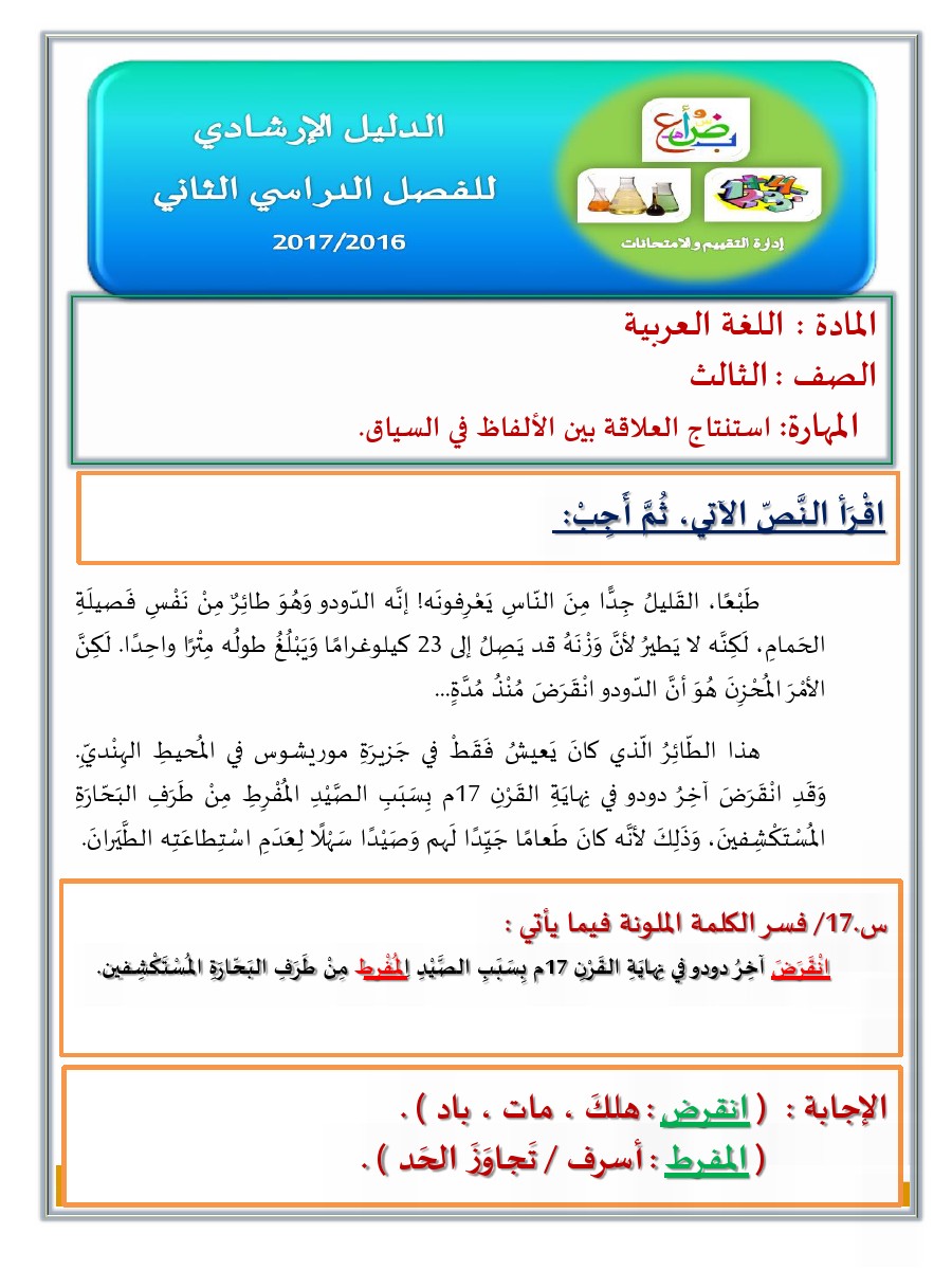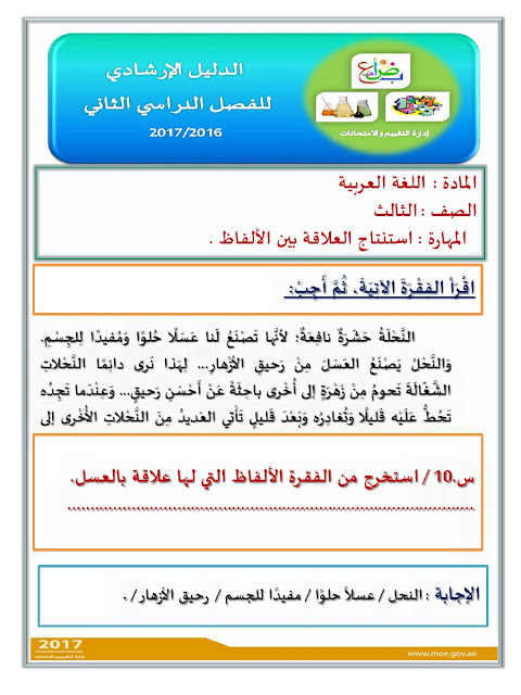 معلومات الملف: الصف الثالث, الفصل الثاني, لغة عربية, الدليل الارشادي لامتحان نهاية الفصل | ||