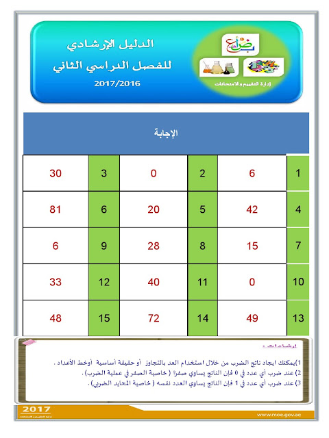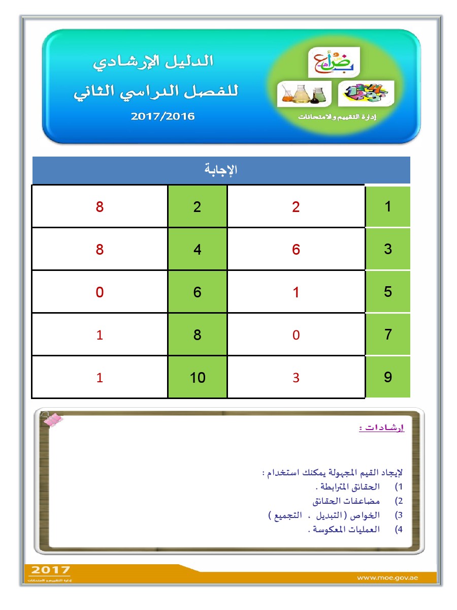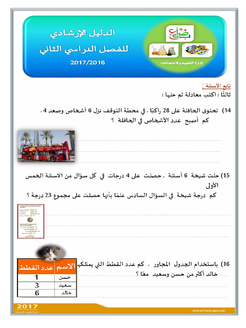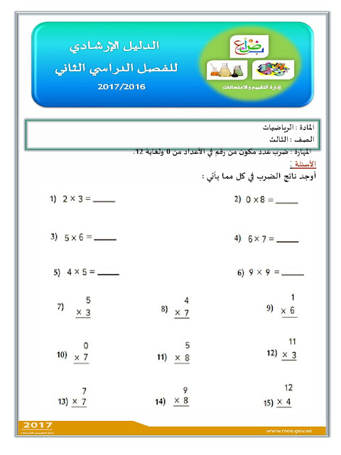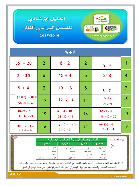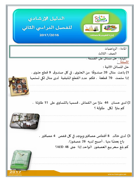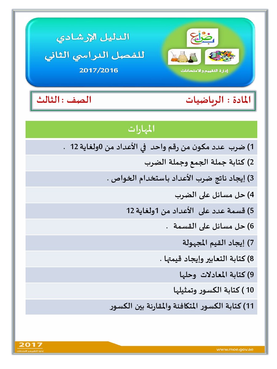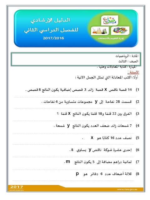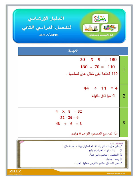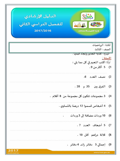 معلومات الملف: الصف الثالث, الفصل الثاني, رياضيات, الدليل الإرشادي لامتحان نهاية الفصل الثاني من العام الدراسي 2016-2017 ـ صور | ||