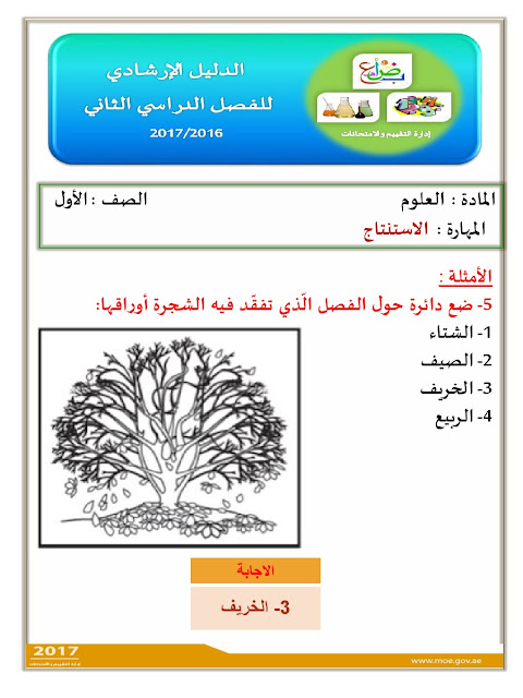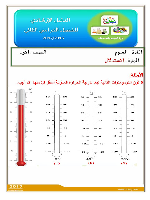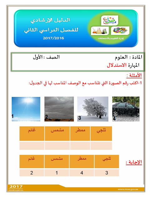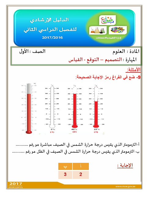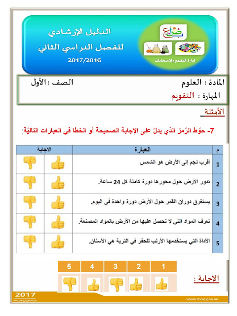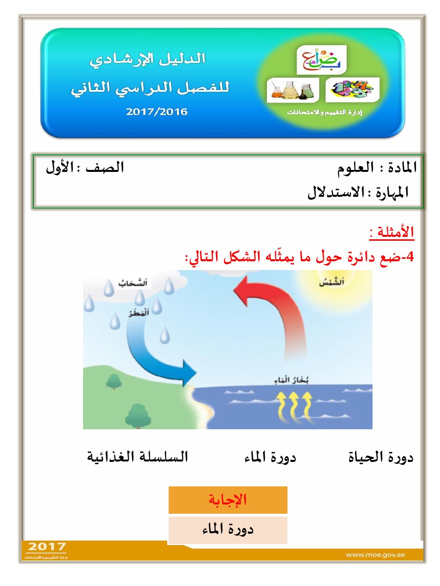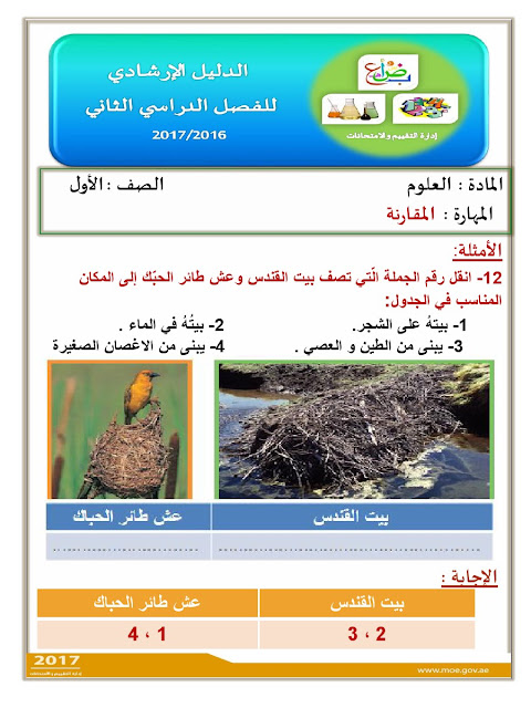 الصف الأول, الفصل الثاني, علوم, الدليل الإرشادي لامتحان نهاية الفصل الثاني 2017