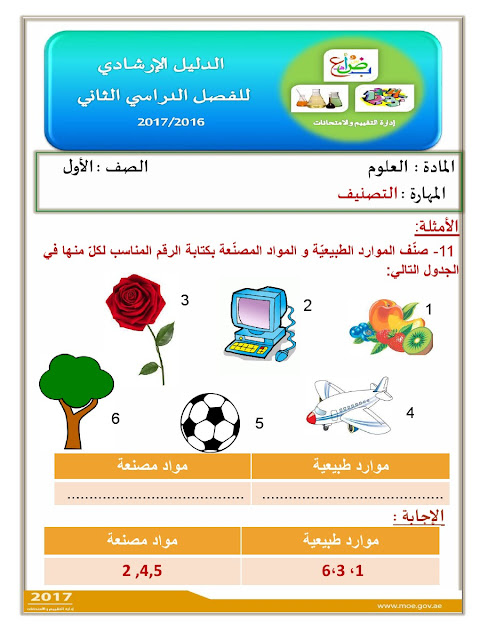 الدليل الإرشادي لامتحان نهاية الفصل الثاني 2017, الصف الأول, علوم, الفصل الثاني, 2016-2017 - المناهج الإماراتية