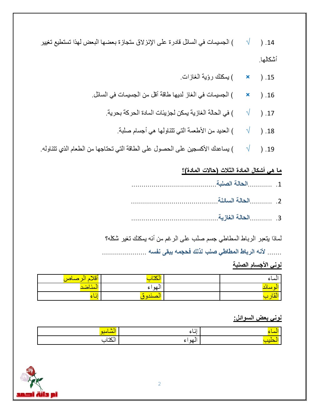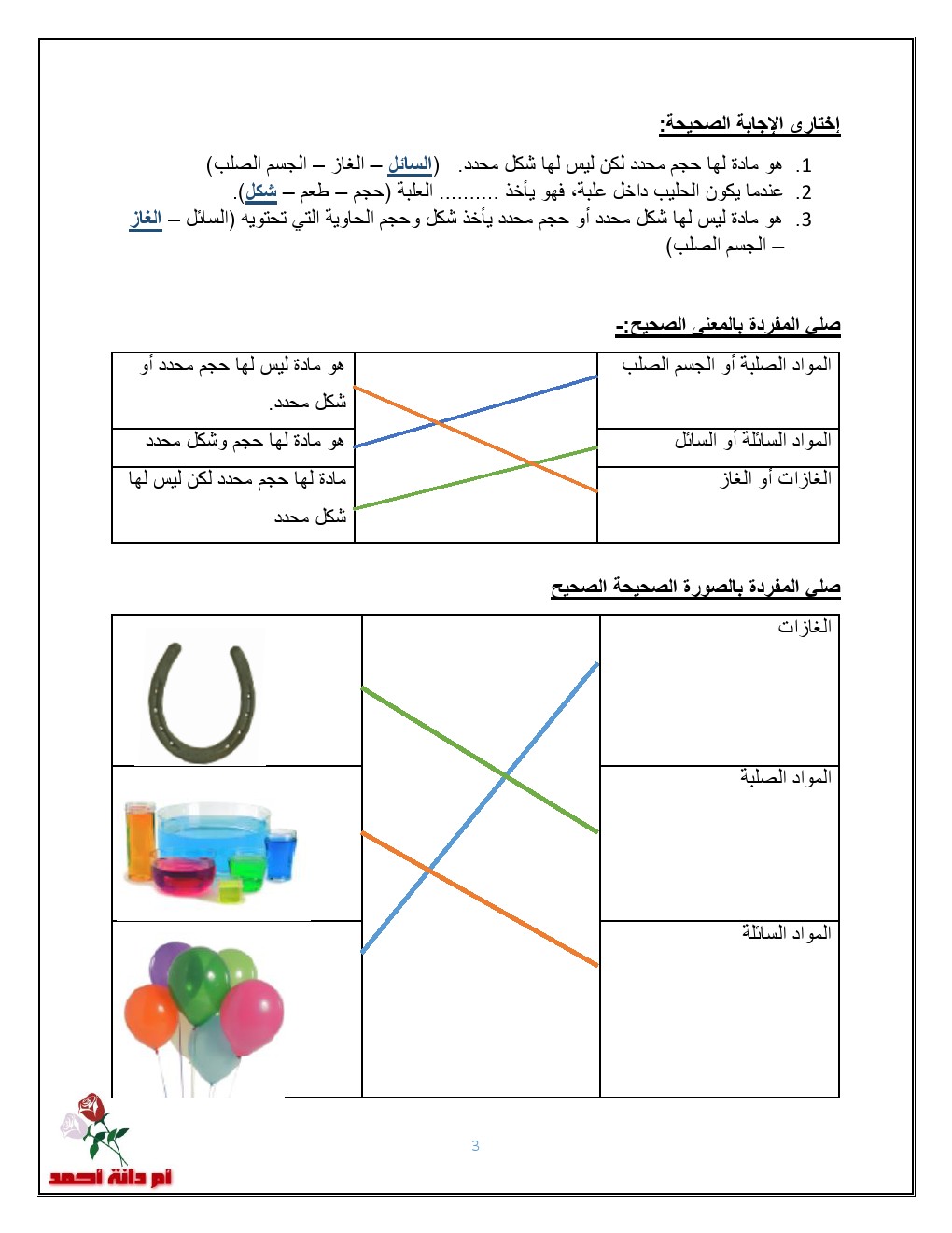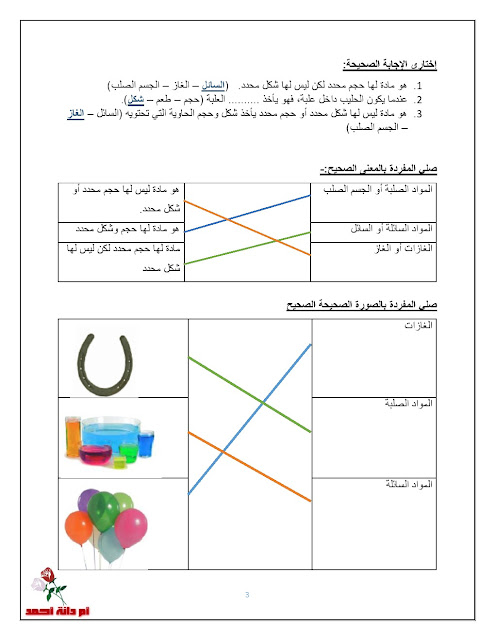 | اختبار في ( الأجسام الصلبة والسوائل والغازات) | ||