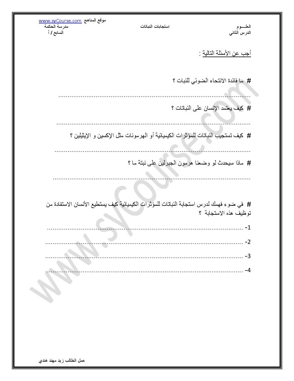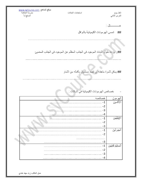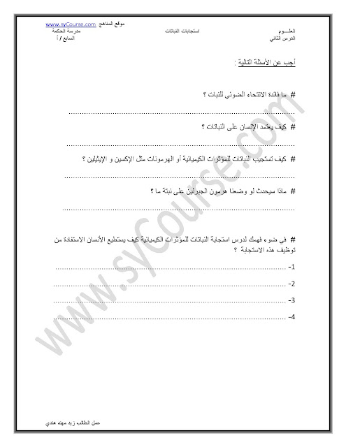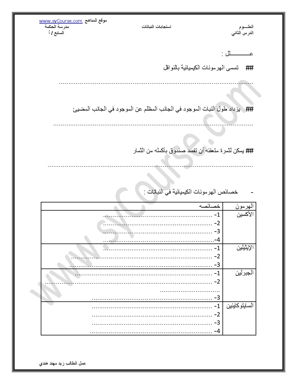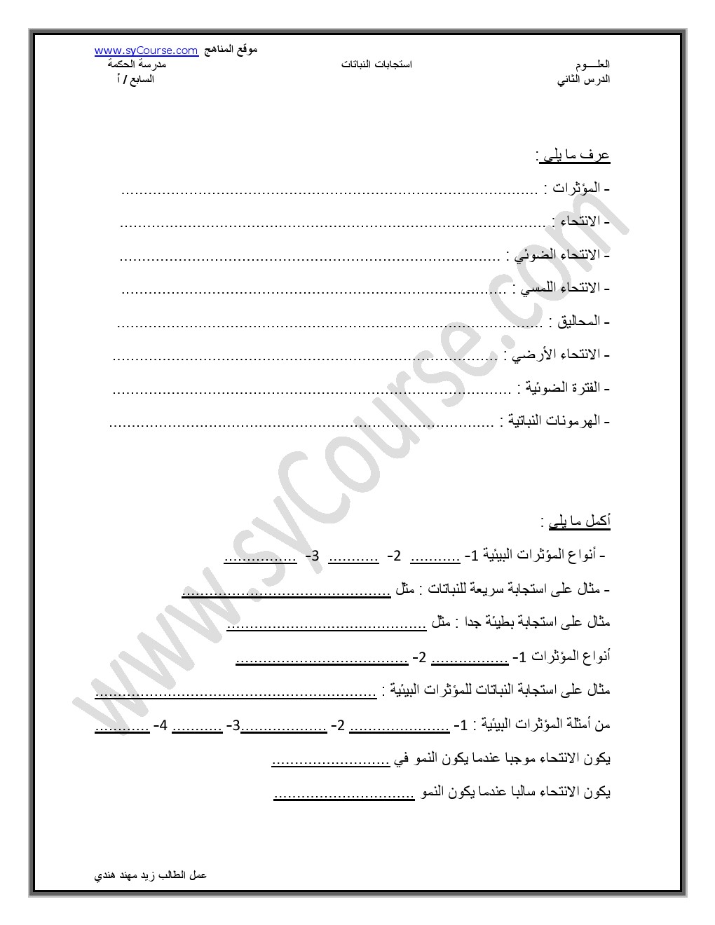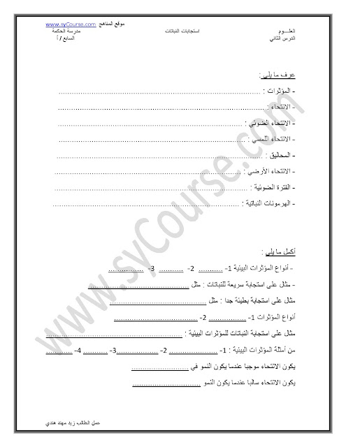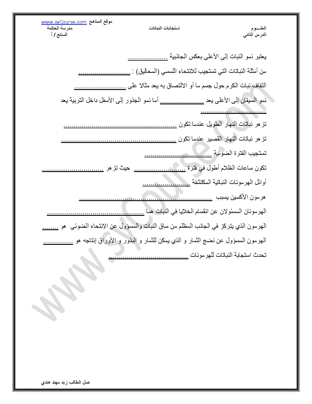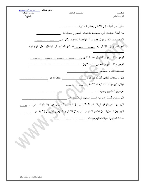 معلومات الملف: الصف السابع, الفصل الثاني, علوم, تلخيص وأوراق عمل درس (استجابات النباتات) | ||